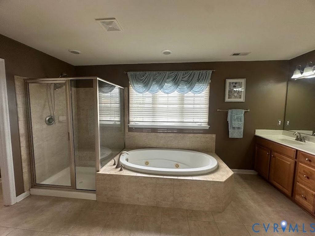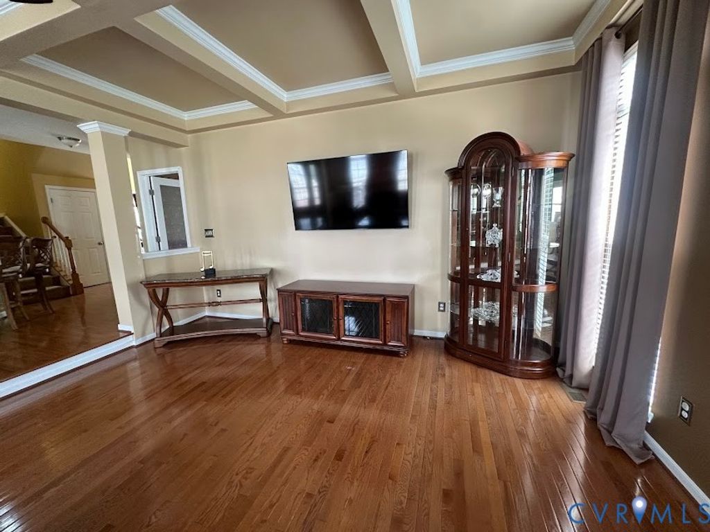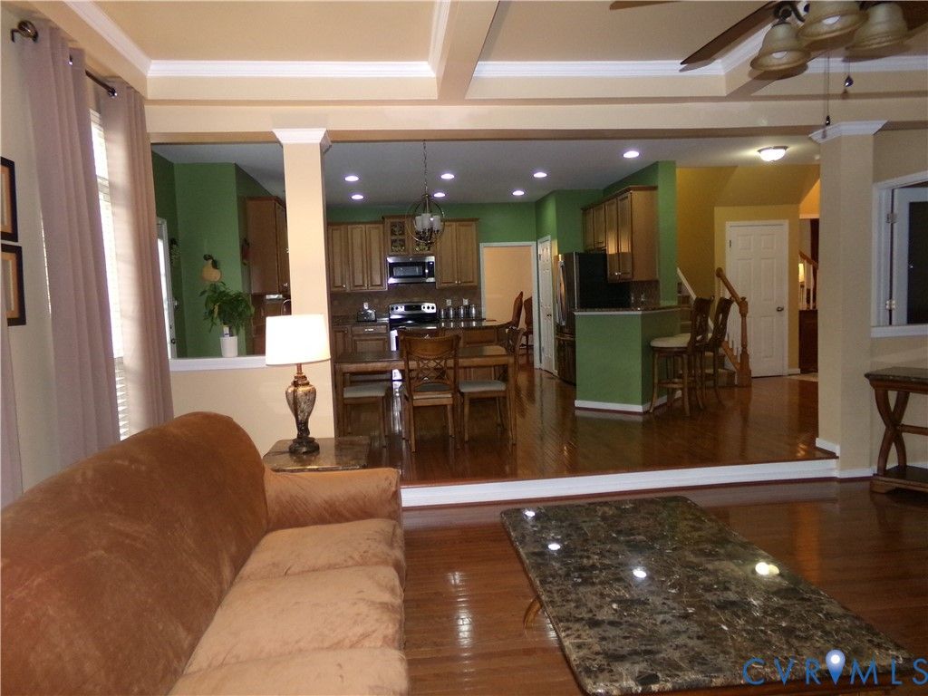 Welcome to this beautiful well maintained 3-Story home that has lots of upgraded features. Interior is 4,101 sq. ft. 5-bedrooms with wood floors throughout the first floor. The foyer has a high ceiling with chandler, tinted windows, double oak staircase, half bath, and two coat closets. Living Room with 9 foot ceilings, crown molding, columns that separate the formal dining room with two piece crown molding, trey ceiling and unique lighting. The large eat-in kitchen features granite counters, recessed lighting, island, breakfast bar, plenty of cabinet space, stove, built-in microwave, refrigerator, pantry and French doors access rear deck. The bright family room is open for entertaining with coffered ceiling, ceiling fan, gas fireplace, ceiling to floor windows, and television mounted on the wall. Additional room with double closet, ceiling fan can be used as guest bedroom, recreation/play room or office. The second floor primary suite features a sitting room with ceiling fan, tinted windows, two walk-in closets, a garden tub with jacuzzi, shower, private toilet, double sink vanities, and ceramic floors. There are 3 other bedrooms with ceiling fans, double closets and a full bathroom in the hallway. Laundry room with storage shelves, washer and dryer hookups. Third floor has additional room space that was used as an exercise room, storage closet, 5th bedroom with walk-in closet and full bath. All window treatment and custom blinds convey. Exterior features brick front, brick entry with columns and vinyl siding. two year old roof, two zone hv/ac system lower unit was replaced in 2024, Landscaped yard, irrigation system front sides and rear, paved driveway, vinyl fence around rear yard, 14' X 16' deck, 10' X 14' storage shed with matching vinyl. Must see to appreciate. This property is conveniently located near Chesterfield Government Center, new walking trails, historical sites, state parks, places of worship, shops, restaurants, schools, and 30 minutes from Downtown Richmond.