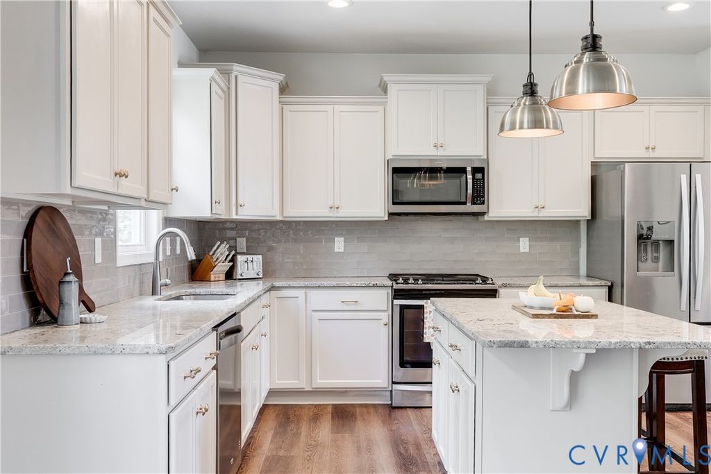 Welcome to this spacious, well-designed home offering the location, amenities, and newer major systems any buyer will appreciate! Situated in the desirable Patriots Landing Community, this 4-bedroom transitional home sits on a cul-de-sac bookended with a nature-made, wooded privacy screen. As you enter from the oversized porchway, the foyer provides a staging area for a "wow" factor sure to leave lasting, first impressions. Brand new luxury vinyl flooring flows into the home's first-floor living spaces, including a dedicated dining room and a fall-ready family room with a gas fireplace. The kitchen comes complete with stainless steel appliances, gas cooking, tasteful cabinetry, and granite countertops. It also offers extra seating for meals or school at the eat-in island, making it as functional as it is stunning. Upstairs, an oversized primary with extra space for a home office or lounging, as well as an attached bath, affords the new owner the oasis we all seek. Three additional bedrooms, a full bathroom, and a laundry room complete the upstairs layout. Outside, the 23x20 2-car garage offers ample space for parking and storage, while the irrigation system makes your bid for "Best Lawn of the Year Award" a potential reality. Cul-de-sac connection to the trails makes jogging or biking a breeze, and the HOA amenities include a fish-stocked lake, community clubhouse, pool, picnic area, and playground. This well-established, commuter-friendly community affords easy access to 64 as well as shopping and dining options already expanding with even more development! We can't wait for you to visit and fall in love! No pun intended.
