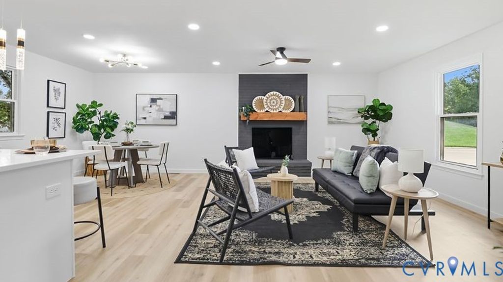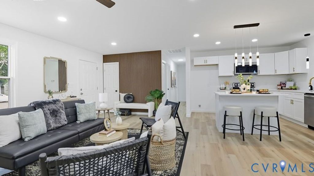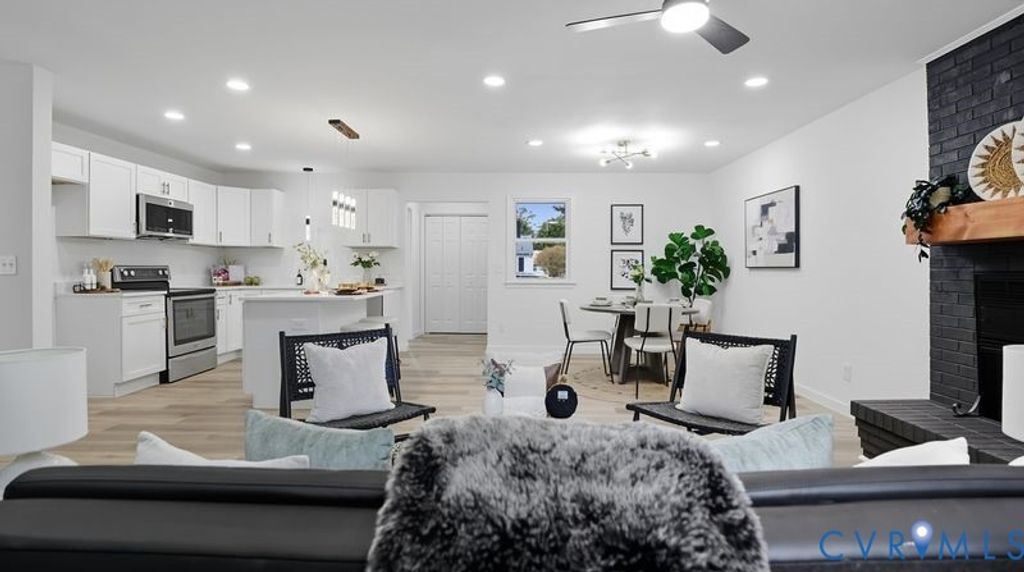 Welcome to this beautifully updated single-story home offering modern style and everyday comfort. The inviting front exterior and welcoming entry lead into a bright open-concept floor plan filled with natural light, wood-style flooring, and recessed lighting. The kitchen features white cabinetry, stainless steel appliances, pendant lighting, and an oversized breakfast bar that opens to the dining and living areas, making it perfect for both entertaining and daily living. Multiple living room spaces offer flexibility, accent walls, and wide windows with serene views. Spacious bedrooms include options with plush carpet, ceiling fans, and accent details. Bathrooms are tastefully updated with modern vanities, decorative tile, and a mix of shower/tub combinations and stand-alone showers. Enjoy outdoor living on the large deck overlooking a private backyard with plenty of space for play, gardening, or entertaining. Additional highlights include a laundry room with washer and dryer hookup, updated trim and baseboards, and move-in ready finishes throughout. Conveniently located near shopping, dining, and commuter routes, this home offers a blend of tranquility and accessibility.