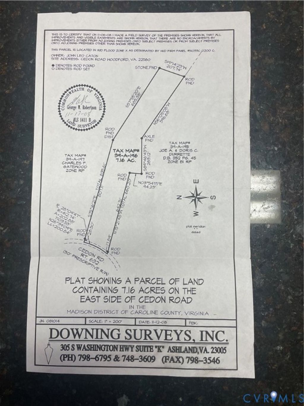 7.16 acres for sale in Woodford off of Cedon Road. Gorgeous view of open land and fields. Convenient to I95. Plat available in photographs.