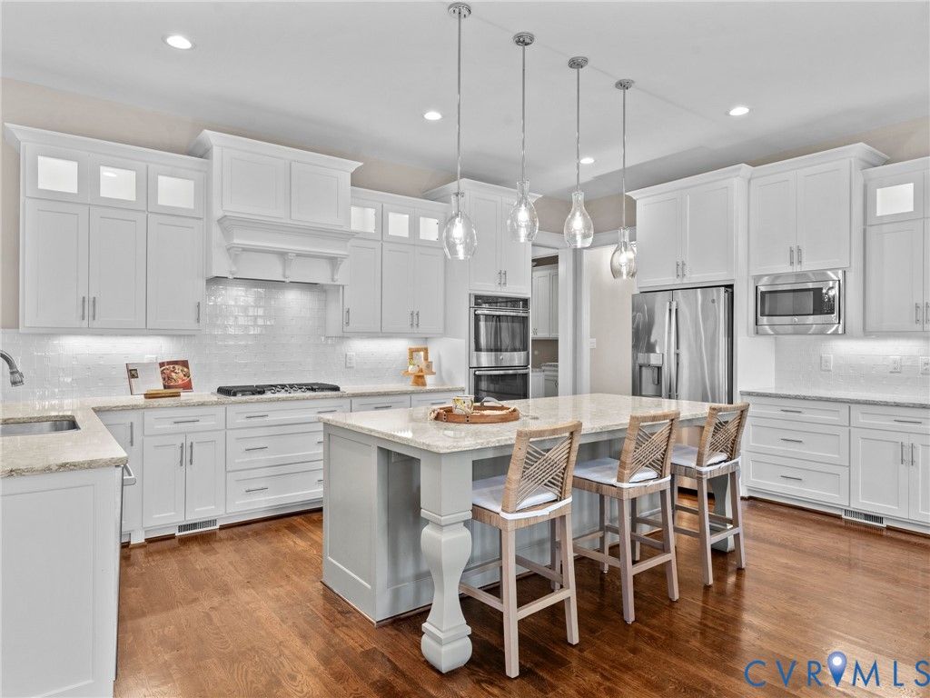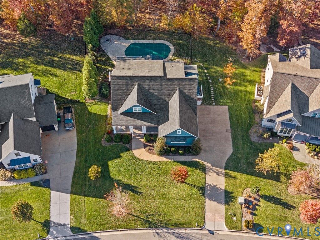 Custom Design | Saltwater Pool | First-Floor Primary | Finished Basement Beautifully situated on a private 0.57-acre cul-de-sac lot in Hallsley, this custom-built home with a saltwater fiberglass pool offers the perfect blend of luxury, function, and comfort for today's lifestyle. Designed for seamless indoor and outdoor entertaining, the home features over 4,800 square feet of thoughtfully finished living space surrounded by mature trees and access to Hallsley's scenic walking trails. The heart of the home is an open, light-filled main level anchored by a chef's kitchen with a quartz-topped oversized island, generous cabinetry, and an inviting dining area. The family room is warm and welcoming with built-ins and natural light throughout, while the adjacent screen porch, grilling deck, and fire pit create a perfect extension for outdoor living. The first-floor primary suite is a true retreat, complete with a sitting area overlooking the pool, dual vanities, a large walk-in shower, and a spacious walk-in closet. Upstairs offers additional spacious bedrooms with walk-in closets and a versatile office or flex space plus additional unfinished storage. The walk-out basement is an entertainer's dream "” a spacious open recreation room with abundant windows, a bar, custom built-ins, and direct access to the fenced-in pool area. A separate storage room accessible from the backyard adds convenient functionality. From the screen porch overlooking the private wooded yard to the pool and patio surround, every detail of this property has been designed for relaxed, refined living in one of Midlothian's most sought-after communities.