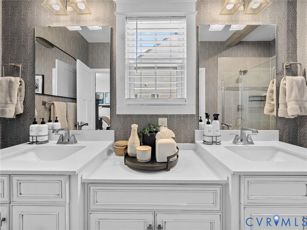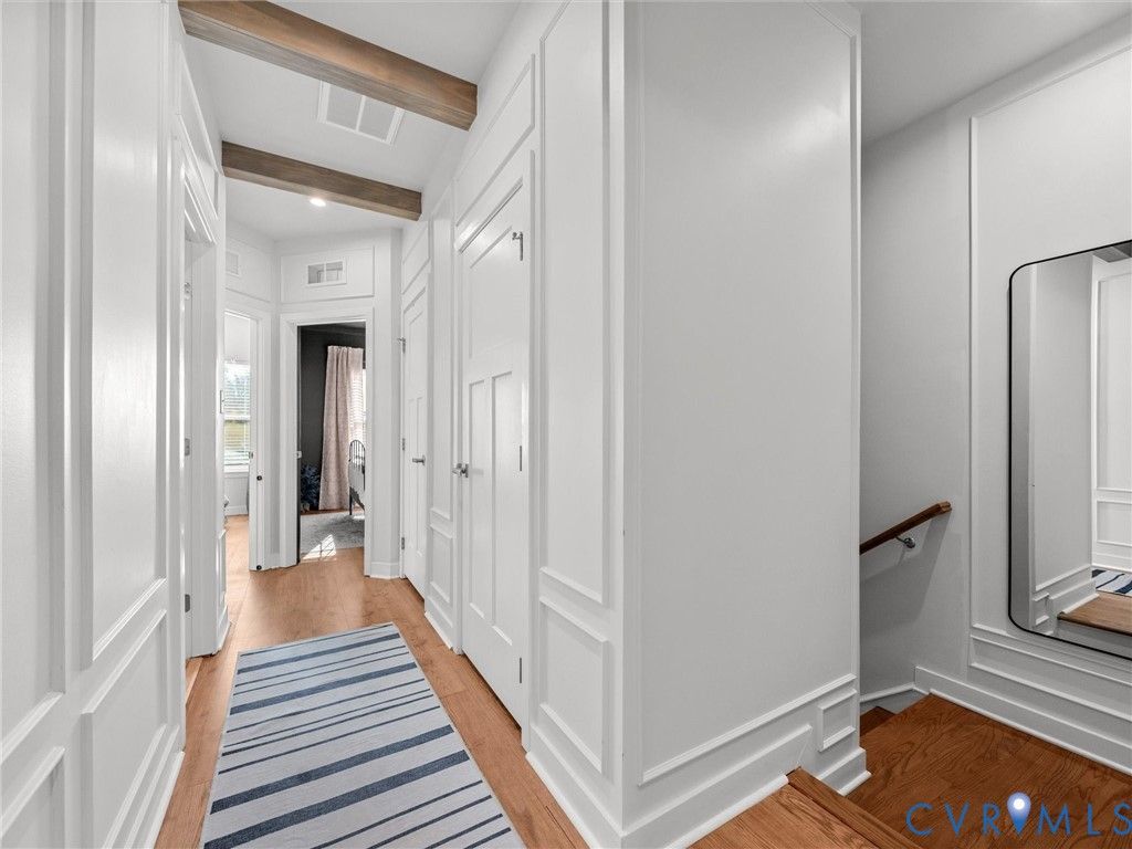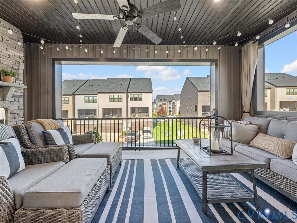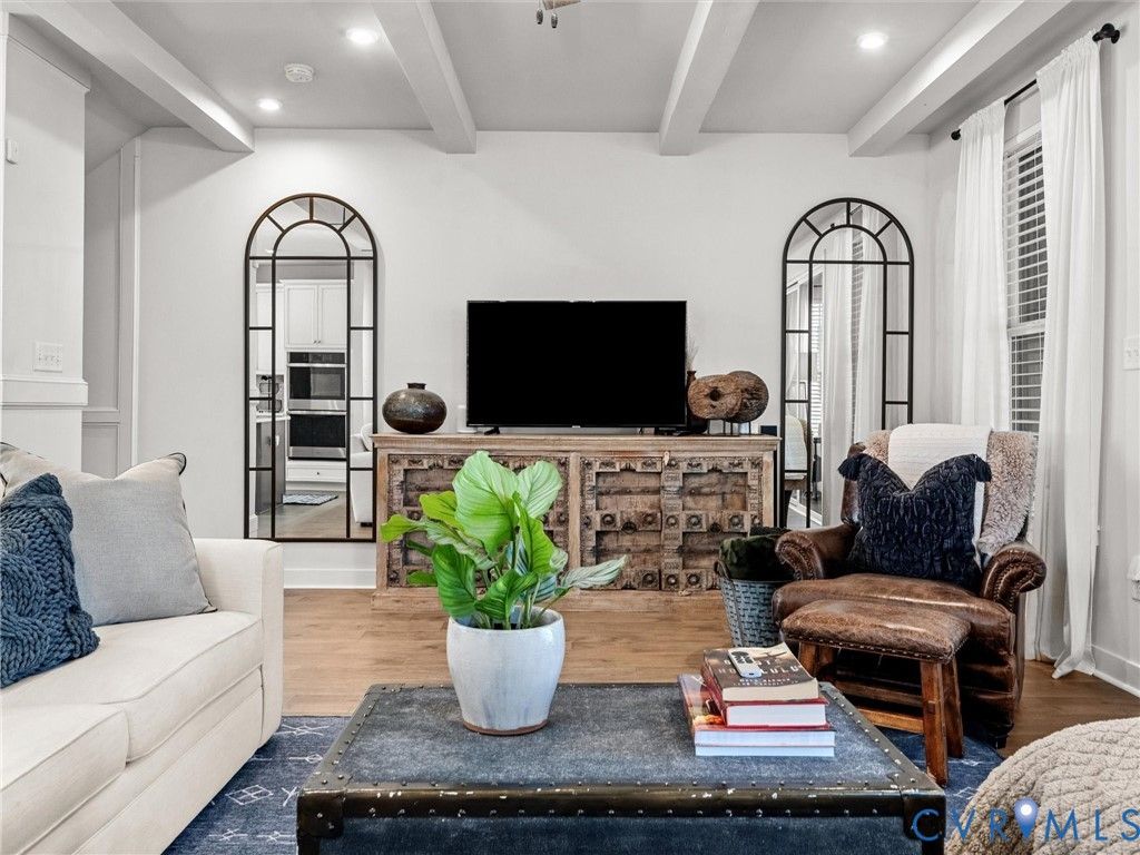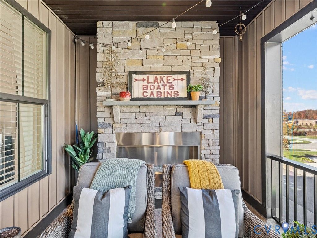 Discover next-level upgrades in this one-of-a-kind 3-bedroom, 3.5-bath, 2,696sf end-unit townhome in the desirable Centerpointe Townes community. From the moment you step inside, the attention to detail is unmistakable. Arched doorways upgraded beams on all 3 levels, hardwood floors throughout (including the stairs), and custom built-ins create a refined, designer feel that elevates every space. The first level offers a spacious rec room with custom bookshelf built-ins, arched doorways, and a custom-built electric fireplace with a stone hearth. This floor provides direct access to the fully finished (taped, mud, and painted), upgraded 2-car garage featuring epoxy floors, built-in cabinetry, a refrigerator, hardwired heater, full-length mirrors, and a hardwired EV charger. The second level presents an open, light-filled layout ideal for everyday living and entertaining. The family room flows into the dining area & gourmet kitchen, complete with quartz countertops, a large island, gas cooking with a ducted exhaust fan, white cabinetry, and a custom built-in desk & storage area. A covered and fully screened porch extends the living space outdoors and includes a stone fireplace for year-round relaxation. The luxurious primary suite is a true retreat. Bright natural light pours through a triple window and highlights the dramatic black shiplap fireplace with a wide wood mantel and marble surround, elegant wall molding, modern sconces, and a charming window seat. The custom walk-in closet offers exceptional storage. The sophisticated bathroom features a double-sink white vanity, herringbone-patterned wallpaper, modern lighting, large mirrors, and a glass-enclosed tile shower with premium finishes. Community amenities include a coworking clubhouse with fitness center, full kitchen, bar, meeting and social spaces & walking trails. Located within walking distance of St. Francis Medical Center & childcare, & minutes to Westchester Commons, top-rated dining, shopping, parks, sports facilities, Powhite Parkway, & Route 288.