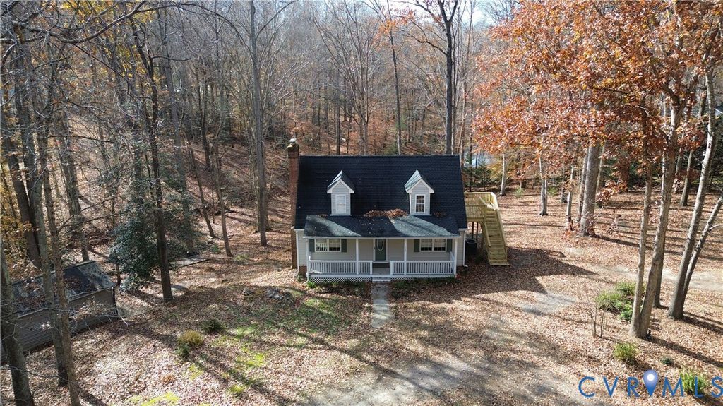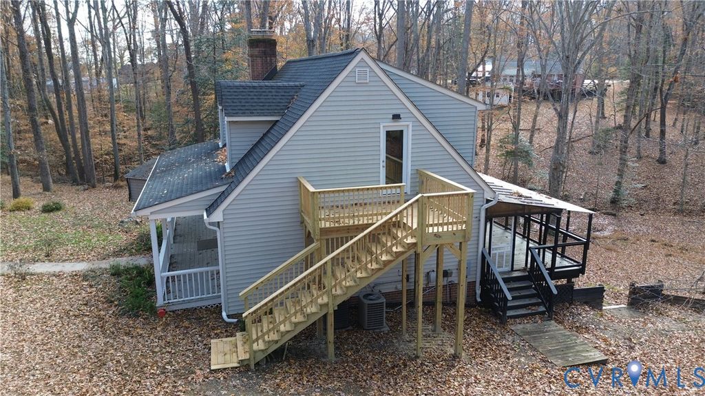 BEAUTIFUL WATER VIEW!! You will find three levels of comfortable living in this quiet serene retreat! This home is tucked back off the road and sits peacefully in the woods quietly watching nature and the colorful leaves fall on the pond. You can sit on your front porch, side veranda, back covered porch room, downstairs open area or anywhere and enjoy the view. Natural beauty surrounds you wherever you are on this property. On the main level you will find a Family room with a cozy fireplace open to the Kitchen with high end appliances, double oven and French doors open to the long covered screened porch. There is also a full bath and 2 nice size bedrooms on this floor. Upstairs there could be another family room, large office or playroom with a separate veranda porch and an extra large bathroom attached to a room the primary bedroom with an open walk-in area with a closet system. Very unique design but also very spacious. Downstairs is for fun and entertaining! There is plenty of space and 3 different areas for recreation, TV/Media area, a second kitchen area with wet bar and a half bath with utility sink. The washer and dryer also convey! This area walks out to an outside covered area and the back yard down to the pond. The metal garage is on a concrete slab and has plenty of room for projects and several vehicles can fit with plenty of room for tools and workspace with 2 extra large roll up doors at each end! There is also a shed for Extra storage!! All of this and more-Come see this beautiful hidden gem. Very close to medical offices, restaurants, and services. Close commute to Mechanicsville, Richmond, Ashland, Tappahannock, West Point, and Williamsburg just off Rt. 360. Call TODAY!!