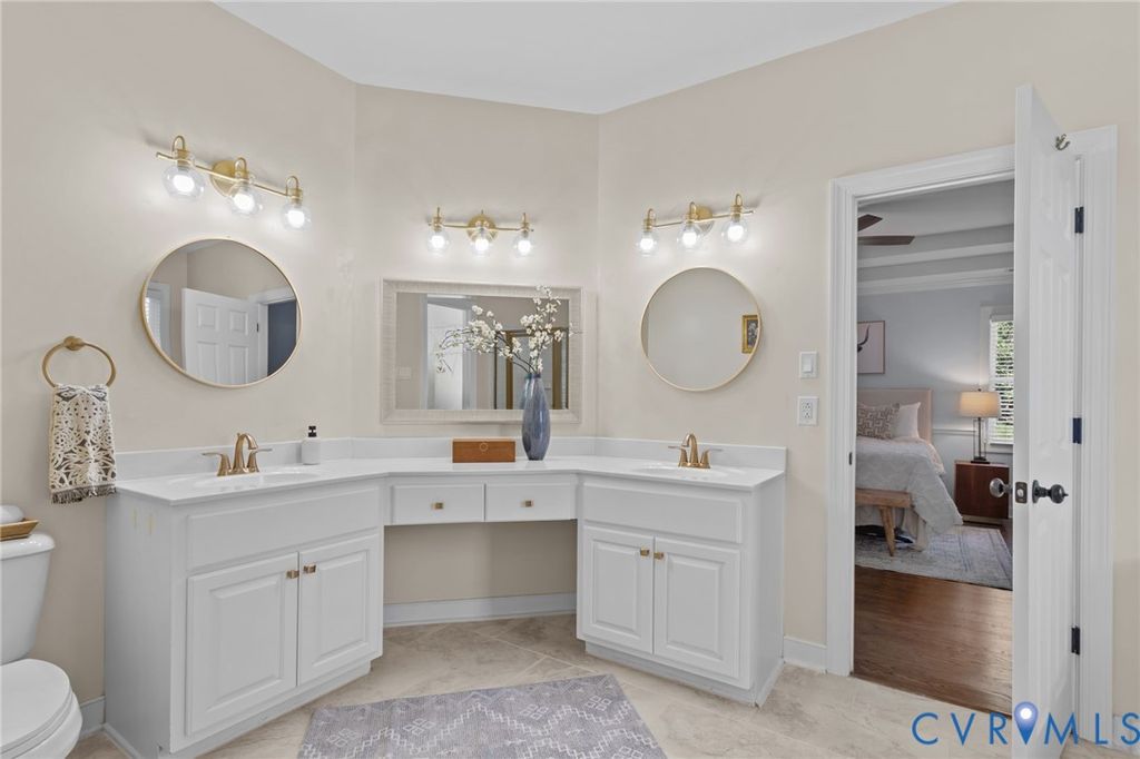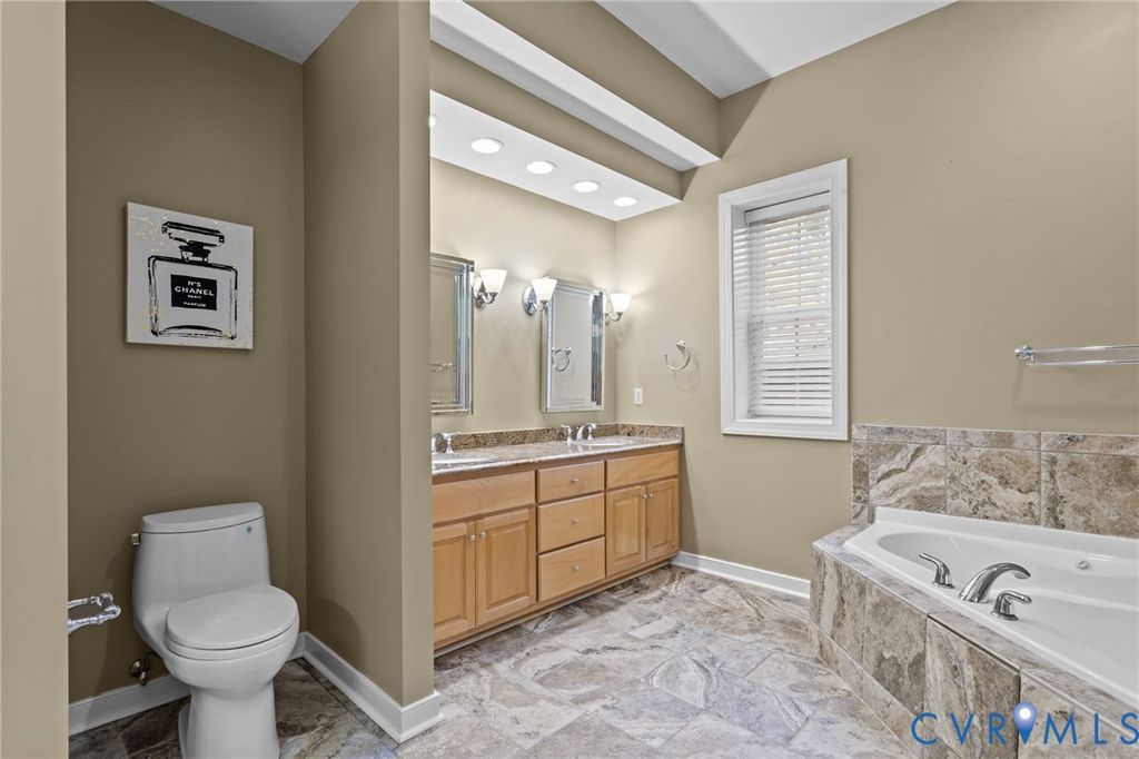 Luxury living in this meticulously cared for home located in the highly sought-after Brickshire golf course community. This Frank Betz designed residence blends timeless design with modern update and sits on a private 1.64 acre wooded lot... One of the largest lots in Brickshire! The home boasts 2 spacious primary suites (1 on the main level and another on the lower level) perfect for multi-generational living or guests. Hardwood floors span the main level, along with vaulted ceilings, beautiful millwork, detailed tray ceilings, and 3 additional bedrooms. The open-concept layout features a chef's kitchen complete with granite countertops, white cabinetry, stainless steel appliances, bar-top seating, and a gas cooktop. The adjacent living room centers around a cozy gas fireplace, while the sunroom provides tranquil views of the wooded preserve. The fully finished lower level is an entertainer's dream, including 2 gas fireplaces, ample storage, and an impressive theater room with direct walk-out access to the fenced-in backyard. This space is ready for hosting with its bar, movie projector, retractable screen, and surround sound. Luxurious ensuite bedroom has a multi-jet tiled shower spa and direct access to the secluded rear patio. A large dual office with custom floor-to-ceiling built-in cabinetry adds flexible space for remote work or study. The 16' x 32' in-ground pool is heated and comes stocked with an electric cover and tanning ledge, a party favorite! Additional features include a huge concrete patio, detached shed, irrigation system, side-loading 2 car garage, main level laundry room, and central vacuum system. The Brickshire community offers resort-style amenities: walking trails, tennis courts, pool, clubhouse, fitness center, golf course, and on-site grill. Just minutes from the Colonial Downs racetrack and casino! With convenient access to I-64, commuting to Richmond or the Peninsula is a breeze. Don't miss your chance to own this exceptional home in one of the area's premier communities!