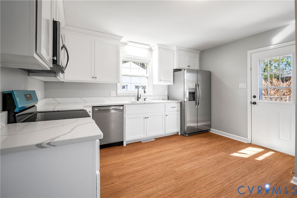 Helping You Find Home! Welcome to this newly remodeled 3-bedroom brick rancher in Prince George"”available now! This updated home features a brand-new white cabinet kitchen with new appliances, remodeled bathrooms, fresh paint, and hardwood flooring throughout. The layout offers two spacious living areas: a front family room/office space as you enter, plus a separate living room with a cozy fireplace. The primary bedroom includes a private full bath with a walk-in shower. Enjoy a huge partially fenced backyard and a detached garage with two single garage doors"”great for storage or hobbies. Move-in ready and beautifully updated!