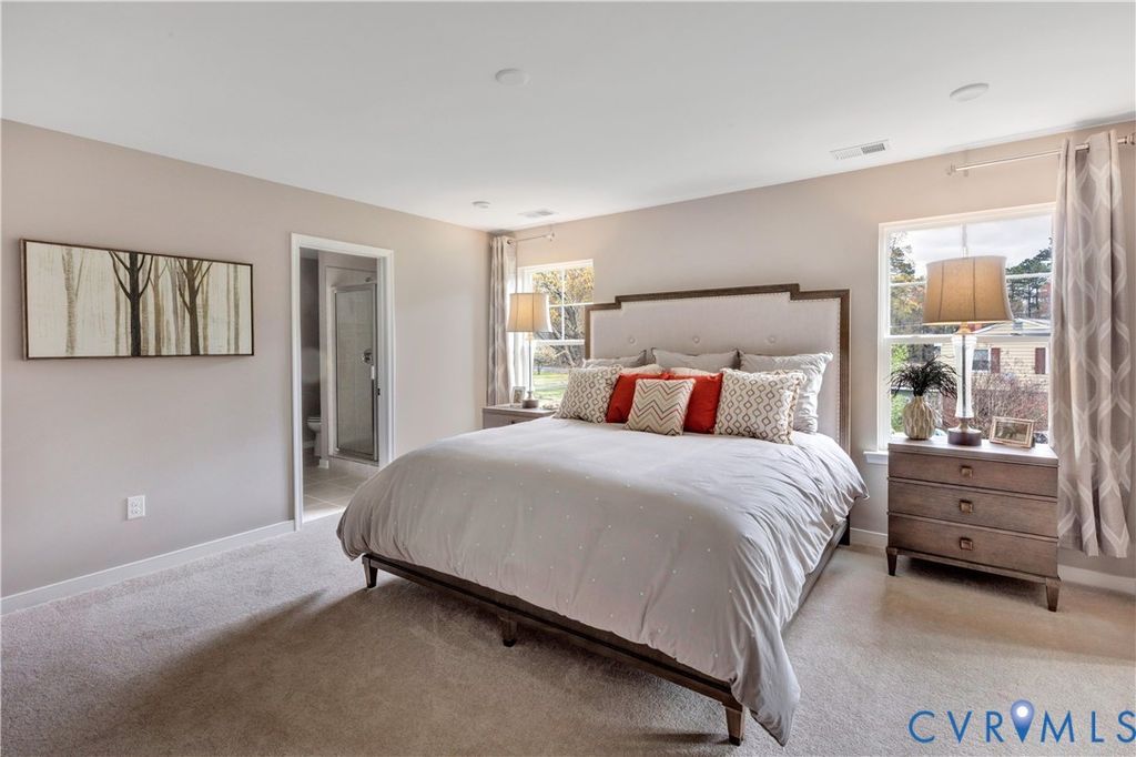 MEET THE KING! This King Designer Home offers 5 BEDROOMS and 3 FULL BATHS! The chef's kitchen has a pantry for storage and plenty of counter space for all your meal prep, select the optional island for additional seating and counter space. It flows seamlessly into the dining area and family room. This home also offers a FIRST FLOOR BEDROOM with walk-in closet and full bath. The second-floor primary suite is a serene retreat, with large walk-in closet and private bath with double vanity. A flexible loft space would make a wonderful playroom or home office. Three additional bedrooms, full bath and laundry room completes the second floor. The King floor plan also offers the option of a first-floor study, morning room loaded with natural light, Primary Suite sitting room, 3-car garage and more! ACT SOON - List price includes base price and first floor bedrooms with full bath; Purchaser may select structural and design options for an additional cost. Nestled on spacious, wooded homesites, Qualla Trace offers a tranquil setting with easy access to Hull Street Road and Iron Bridge Road for dining, shopping, and entertainment. Enjoy stress-free commutes with convenient routes to Route 1, the U.S. Defense Supply Center and 288, making it simple to navigate the Richmond metro area. (HOME IS NOT YET BUILT - Photos & visual tour are from builder's library & shown as an example only. Features & options will vary).