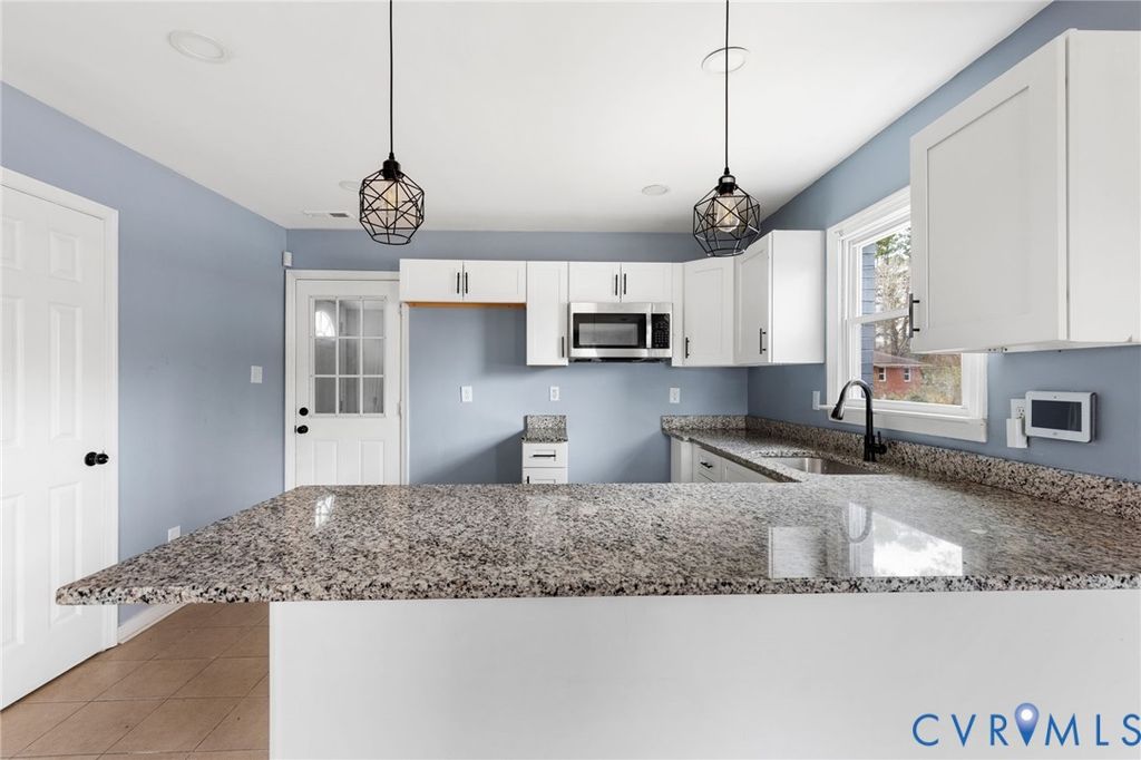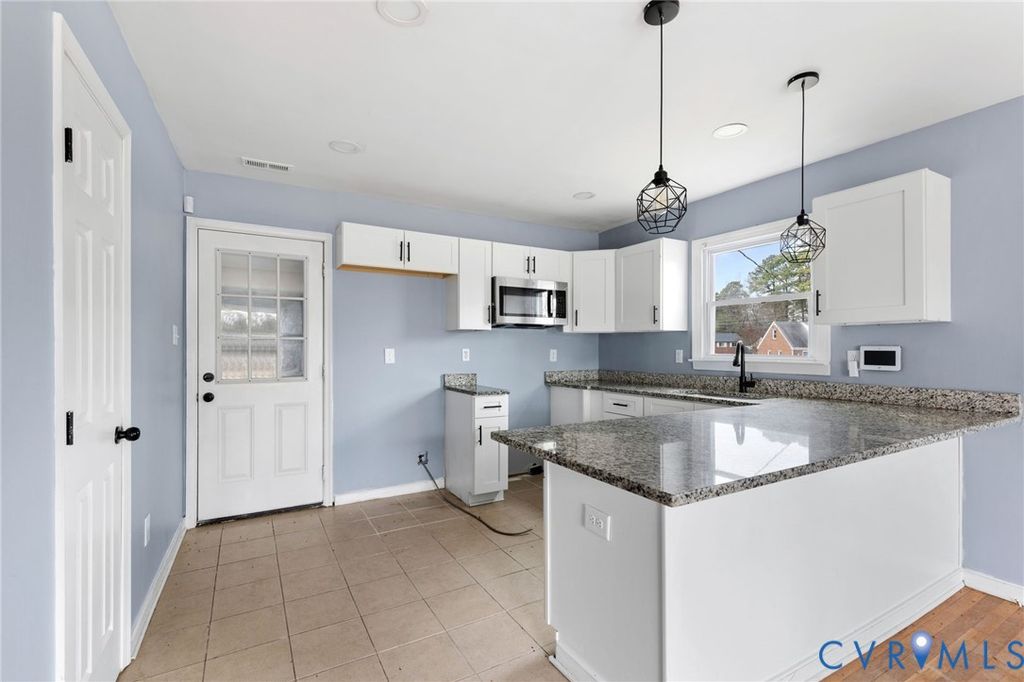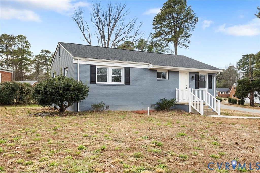 Welcome home to this beautifully renovated brick rancher in the heart of Petersburg, offering timeless charm paired with modern updates throughout. Step inside to a bright and inviting family room featuring gleaming hardwood floors, an updated ceiling fan, and an abundance of natural light. The gourmet kitchen is a true highlight, boasting granite countertops, a breakfast bar with seating, sleek modern cabinetry, tile flooring, a pantry, and easy access to the laundry and outdoor living space, perfect for entertaining or everyday living. The spacious primary bedroom features hardwood floors, an oversized closet, and a private en suite bath complete with tile flooring, an oversized granite vanity, contemporary cabinetry, and a walk-in shower with a glass enclosure. Additional bedrooms also offer hardwood floors and generous closet space. A stylish hall bath includes a granite-topped vanity, tile floors, and a tub/shower combination. Outside, enjoy a sprawling backyard that provides plenty of room for relaxation, play, or future outdoor enhancements. This move-in-ready home combines comfort, style, and functionality, don't miss your opportunity to make it yours! THE HOUSE IS WINTERTIZED DO NOT USE THE BATHROOMS!! NO LIGHTS are on. DO NOT TURN ON ANY BREAKERS!