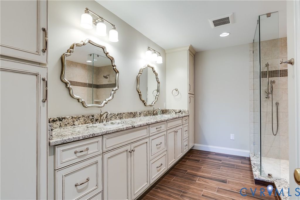 Welcome to this contemporary home nestled in Kanawha Trace, one of Richmond City's hidden-gem neighborhoods. Step into the beautiful two-story foyer, where an open layout and amazing windows immediately greet you, flooding the space with natural light. To the right, you'll find the formal living room, perfect for a cozy reading spot or enjoying your morning coffee. To the left is the formal dining room, which flows seamlessly into the professionally renovated kitchen. The kitchen is a chef's delight, featuring a huge island with seating, Sub-zero dual-zone wine cooler, a high-end Wolf dual-fuel gas range with hood, Sub-Zero refrigerator, a stylish tile backsplash, under-cabinet lighting, microwave drawer, recessed lighting and quartz countertops. A convenient walk-in pantry and a powder room are ideally located between the garage and the kitchen. The magnificent family room boasts two-story ceilings, a linear gas fireplace, built-ins, and incredible windows. The first floor also includes a bedroom with a renovated ensuite bathroom featuring a tile walk-in shower. The second floor is home to the oversized primary suite, complete with a dedicated sitting area, a walk-in closet with custom organization, and an updated ensuite bath. The luxurious primary bath offers ample storage, a double vanity, an oversized tile shower, and a private water closet. A versatile flex space with built-ins"”perfect for an office or craft room"”is accessible through the primary bedroom or a separate back staircase. Additionally, this level features two more bedrooms that share a renovated bathroom with a tub. Enjoy views of the expansive, flat, fenced rear yard from the maintenance-free deck. A two-car attached garage offers easy access. The location is unbeatable, with Byrd Park, The Carillon, Carytown, and more just minutes away.