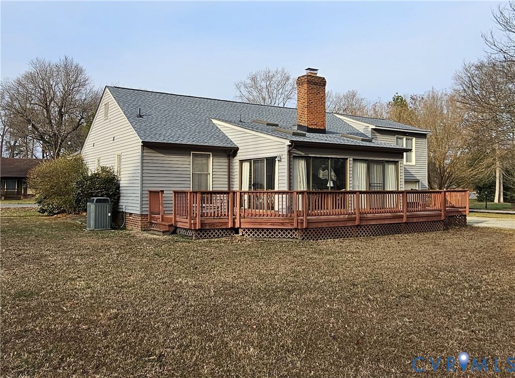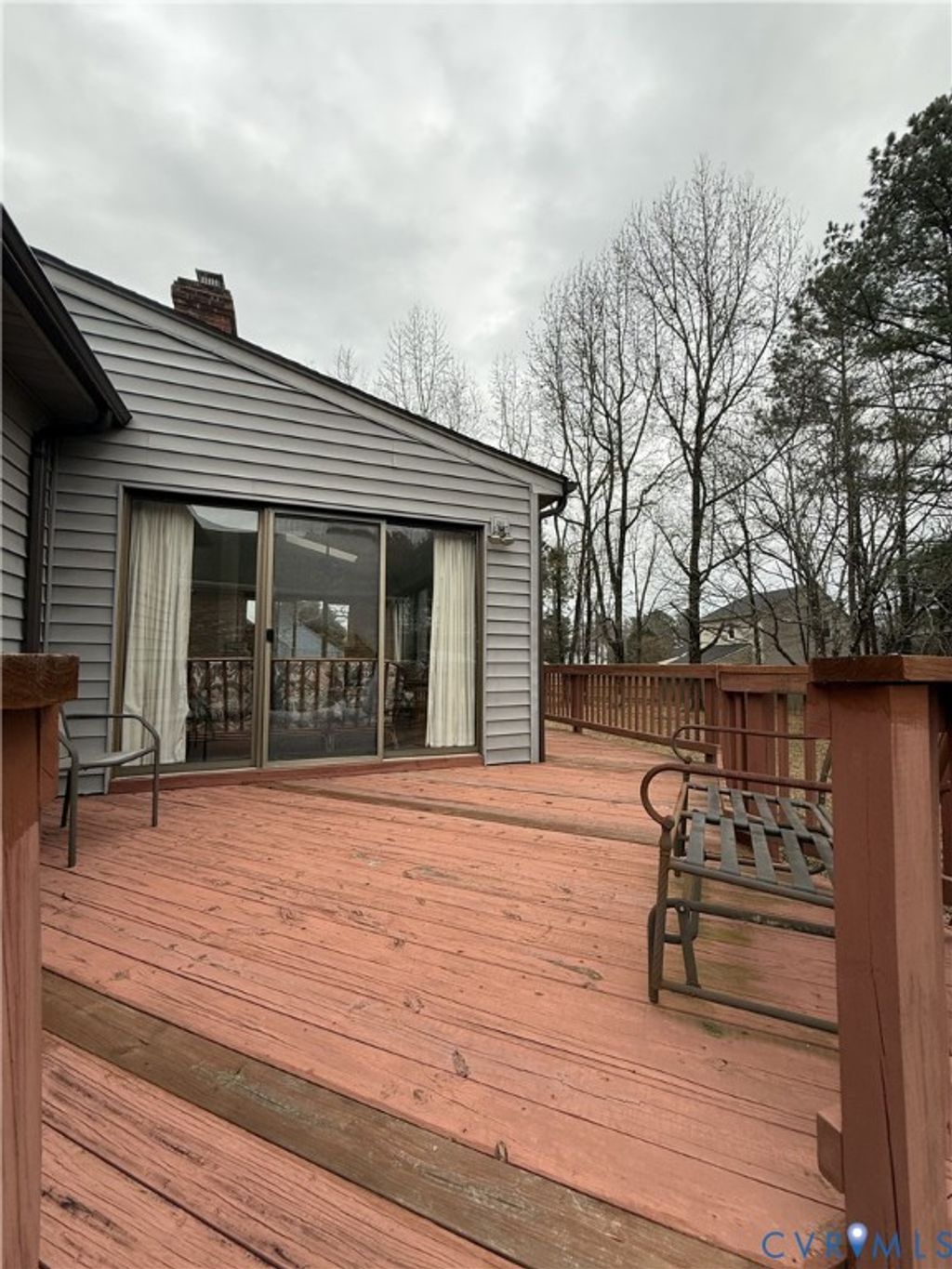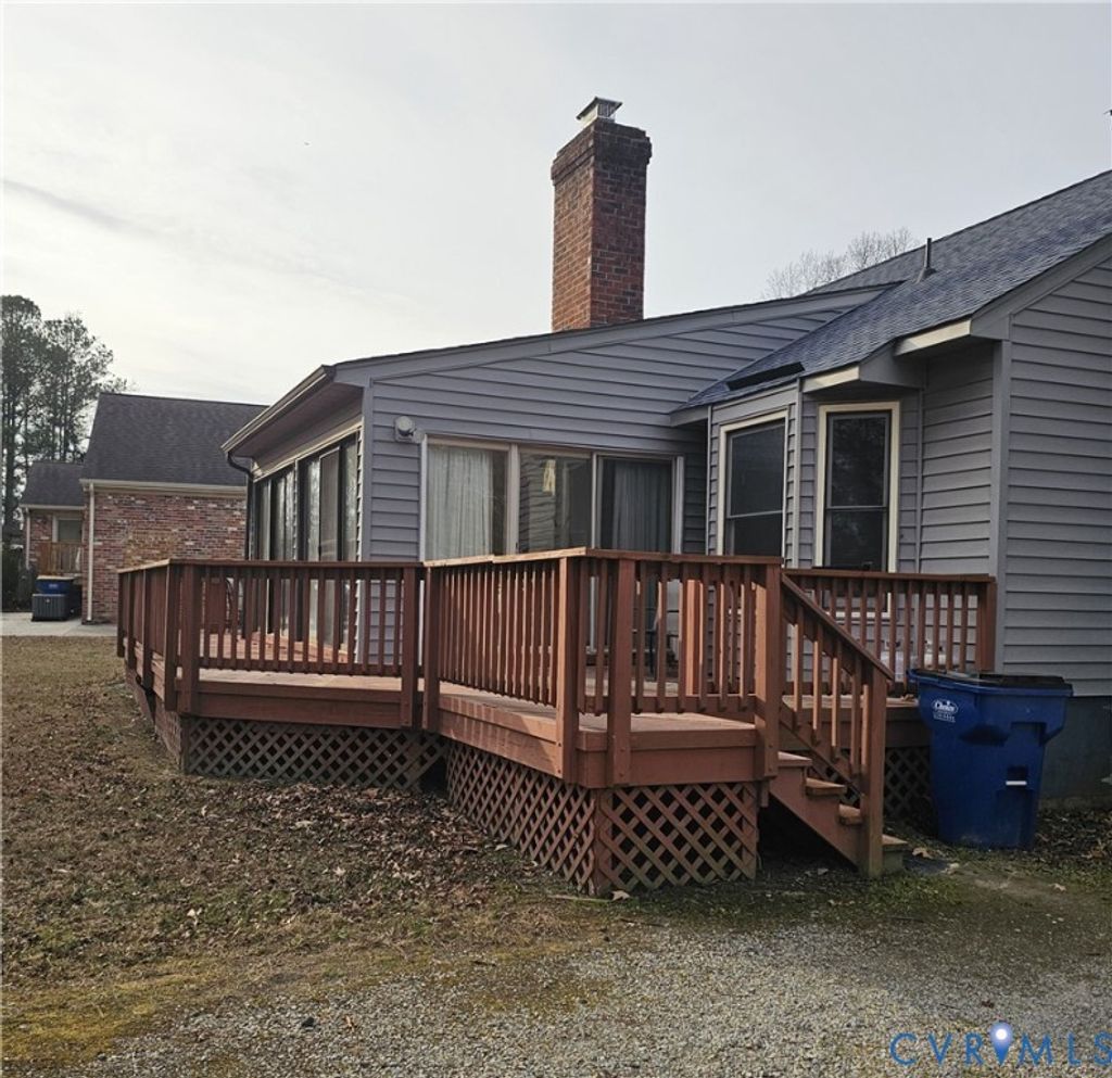 Welcome to this one story 2115 square foot home in Irongate subdivision. Conveniently located to route 150, interstates 95, Powhite, 288 and 64. This home is being sold as is and is loaded with all the rooms you need to grow your family or downsize to first floor living. It needs a little updating and TLC to bring it back to its former shine. It has a newer roof, new floor and walk in shower in hall bath with handrails. Newer appliances which convey. Other amenities are vinyl siding, public water and sewer, wood burning brick fireplace, large sunroom with surrounding sliding glass doors and wrap around rear deck with large decks on each side of sunroom. Primary bedroom opens into the sunroom and has access to rear deck. Walk in closet and ensuite. Two other large bedrooms with amble closet space and access to hall laundry center. Plenty of storage throughout home. Large kitchen with breakfast nook bay window and large pantry. Pass through window over the sink makes it easy to join in the activities in the large vaulted and wood beamed ceiling family room. Formal dining room is easily accessible off kitchen or can be used as a formal living room. Just when you think that's the end of this beautiful home, a large bonus bedroom over a one car extra-large garage with workshop emerges. Back yard entry way into the garage with natural light from 2 large windows and work benches. Come take a look and make this home yours today!