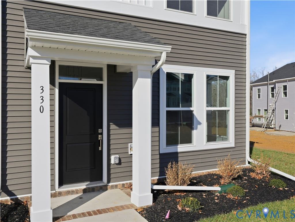 *MOVE IN READY* Welcome to The Daphne, a beautifully designed end-unit townhome offering 1,472 square feet of modern living space. The open first floor features luxury vinyl plank flooring throughout, a spacious great room, and a bright kitchen with white cabinetry, a Quill gray island, White Ornamental granite countertops, glossy white backsplash, and GE stainless steel appliances. A convenient powder room completes the main level. Upstairs, the primary suite is a true retreat with a boxed ceiling, walk-in closet, and private bath featuring a quartz vanity, Fair ceramic tile floors and shower walls, and bold black fixtures. Two additional bedrooms, a hall bath with matching finishes, and the included stacked GE washer and dryer provide comfort and convenience. Designer details include Craftsman rails with metal spindles, raised five-panel doors, black pendant lighting, and LED upgrades throughout. The exterior highlights timeless curb appeal with Charcoal Smoke siding, Glacier White board-and-batten accents, Bessemer Gray brick, and a bold black front door. With thoughtful design, stylish finishes, and modern features like a video doorbell and structured wiring, the Daphne end unit is the perfect combination of comfort and character in McCauley Park. *Photos are of the actual home* *First-time homebuyer grants available*