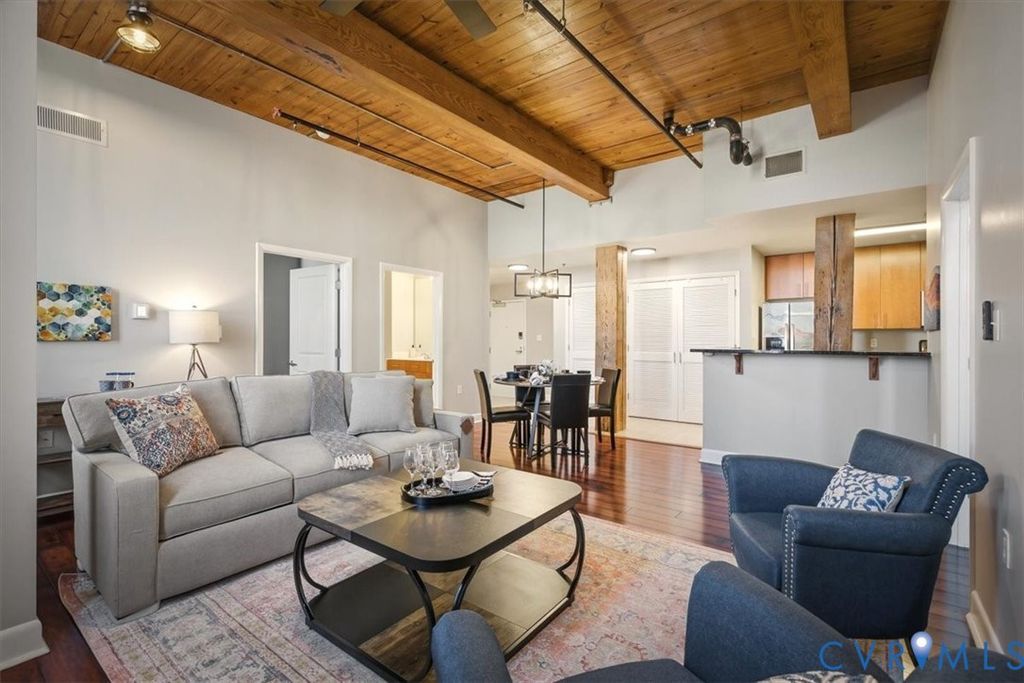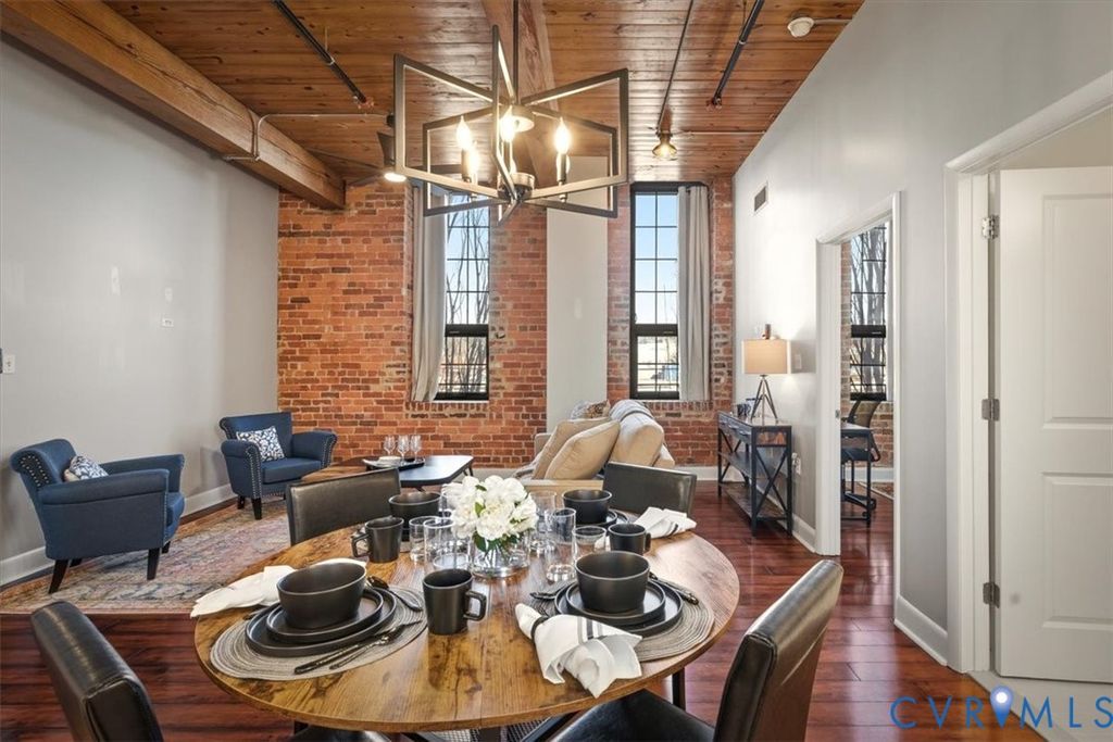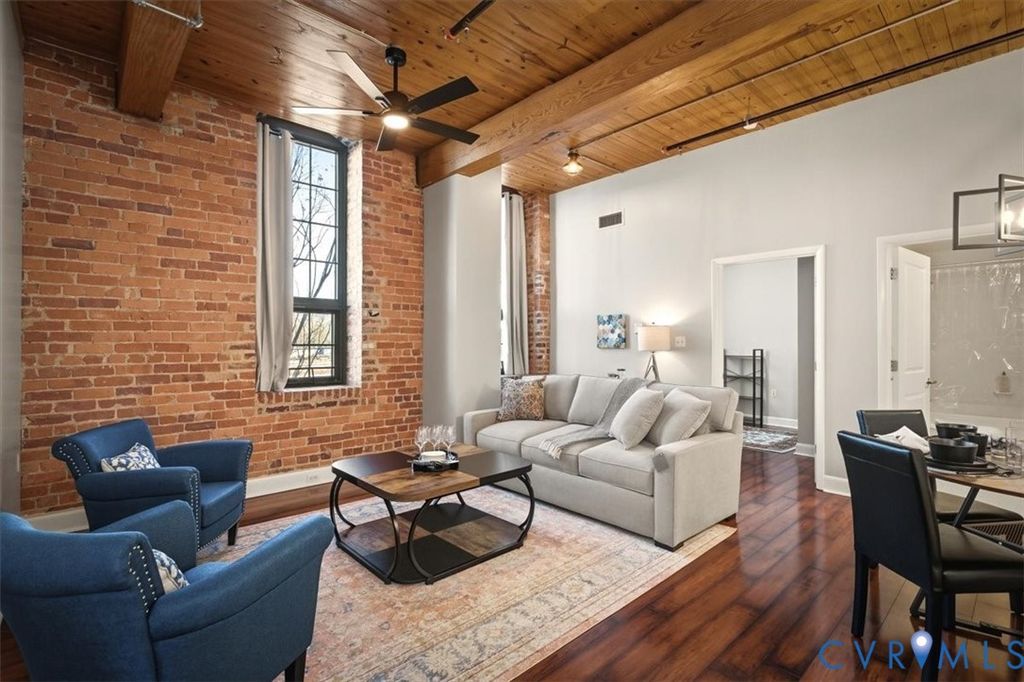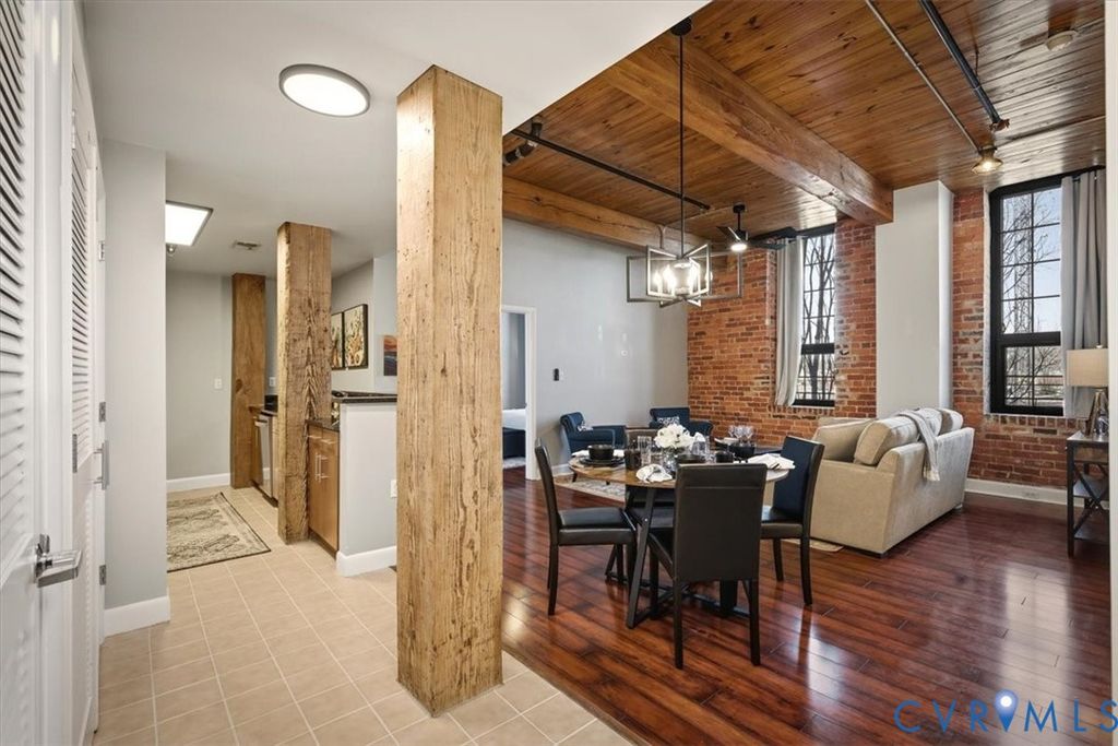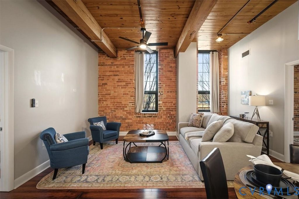 This remarkable, fully furnished condo blends Richmond's historic character with modern upgrades, featuring exposed brick walls and original wooden beams that add timeless charm. Offering two bedrooms and two full bathrooms, the home includes an open kitchen with granite countertops, upgraded cabinetry, hardwood floors, soaring ceilings, and generous closet space. Tile and grout have been professionally refurbished throughout the entry foyer, kitchen, and both bathrooms, creating a fresh, polished look. The kitchen is fully equipped with all appliances, a new double-bowl stainless steel sink, new faucet, and new stove eyes and pans, along with a complete set of dishes, silverware, glassware, stemware, pots, pans, and utensils. Additional updates include a newer HVAC system, fresh paint, washer and dryer with transferable warranty, all new ceiling fans, and updated lighting fixtures throughout the kitchen, dining area, entry foyer, living room, and bedrooms. This truly turn-key residence comes furnished with all new furniture for the living room, dining room, bedroom, entry foyer, and office, as well as artwork, lamps with built-in charging ports, and complete kitchen ware, bedroom, and bathroom linens, including pillows, shower curtains, placemats, and more. Linen-look blackout curtains provide 100% UV protection and energy-saving insulation. The unit includes a deeded garage parking space (#312) and a temperature-controlled private storage unit (#68A) conveniently located near the front door. Located in the vibrant Rocketts Landing community, residents enjoy resort-style amenities including a 24-hour secured fitness center across the street, a riverfront pool, grilling stations, and a play area, all just steps away. Walk to nearby restaurants, local conveniences, and craft breweries, and enjoy an unbeatable riverfront lifestyle in one of Richmond's most desirable communities.
