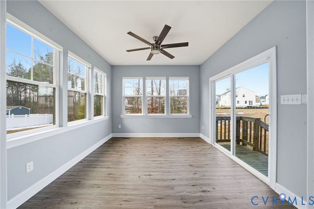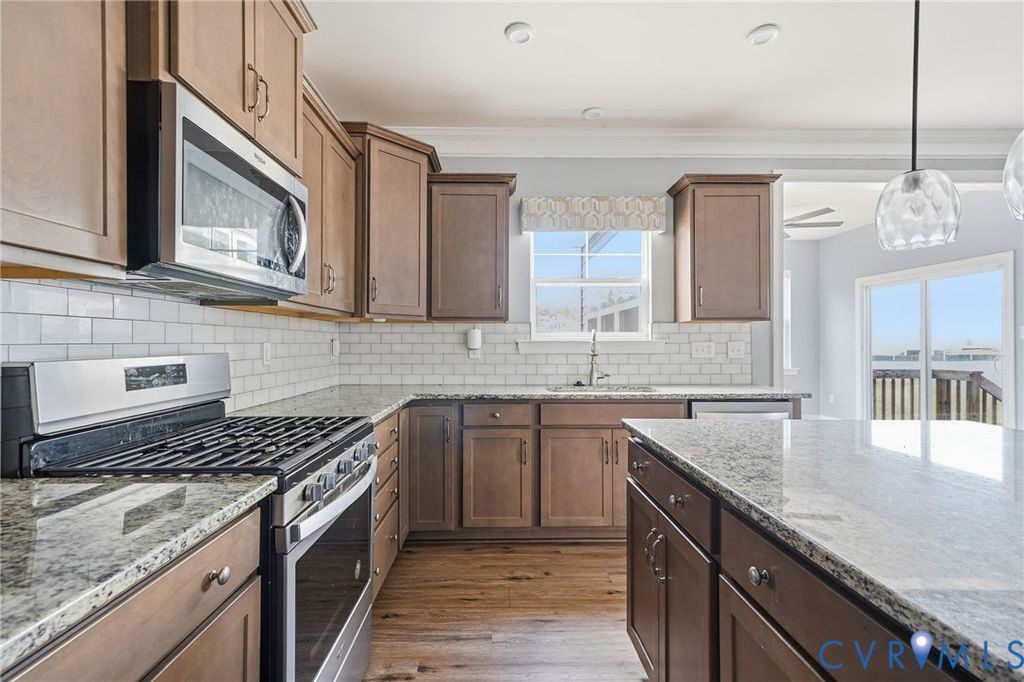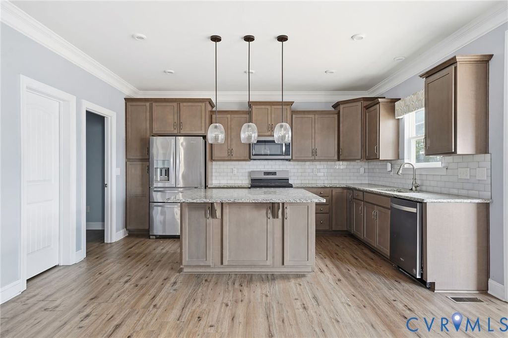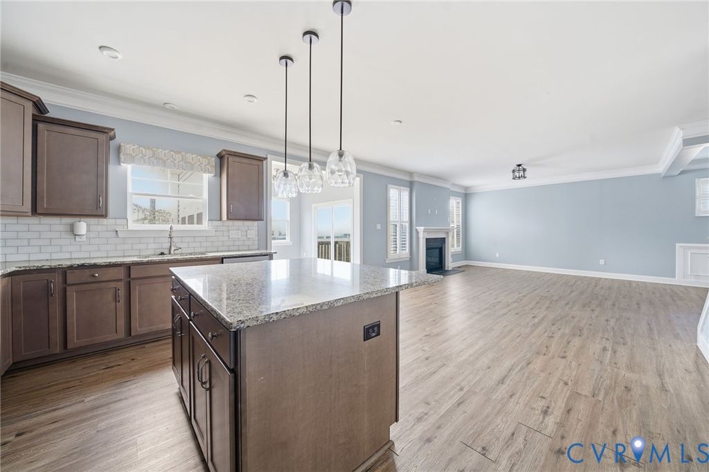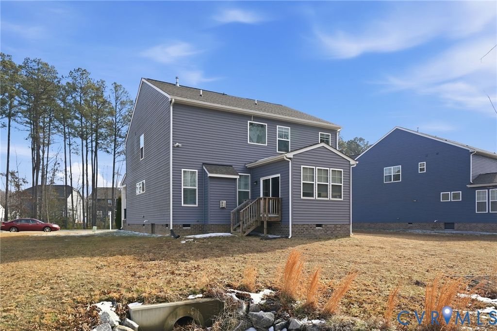 Welcome to this beautifully maintained 4-bedroom, 2.5-bath home in desirable Henrico County offering 2,749 finished square feet of thoughtfully designed living space "” plus a semi-finished two-car garage full of potential. The first floor showcases an open-concept layout where the dining room, kitchen, living room, and sunroom flow seamlessly together, creating the perfect space for everyday living and entertaining. The spacious living area is anchored by a cozy gas fireplace and enhanced by luxury vinyl plank flooring, abundant natural light, and light neutral paint tones throughout. The kitchen is both stylish and functional, featuring light-stained oak cabinetry, a clean white subway tile backsplash, stainless steel appliances (which convey), and a large island with seating illuminated by elegant pendant lighting. Extensive millwork details including chair rail, picture molding, and triple crown molding add timeless character and architectural appeal. Upstairs, a generous loft area connects all four bedrooms, including a true primary suite complete with a private en suite bath. The exterior combines brick veneer and siding for classic curb appeal, highlighted by a concrete and brick front porch and front-loading garage entry. The semi-finished garage offers flexibility for storage, a workshop, home gym, or future finished space. Situated on a large, private lot with no immediate rear neighbor, this property provides a peaceful outdoor setting. Additional features include an electric heat pump and tankless water heater for energy efficiency. This sun-filled, airy home blends comfort, style, and functionality "” ready for its next owner to make it their own.