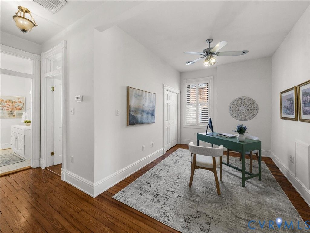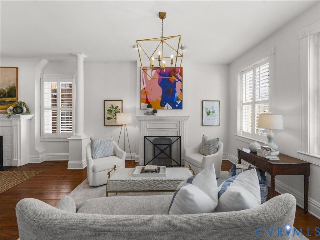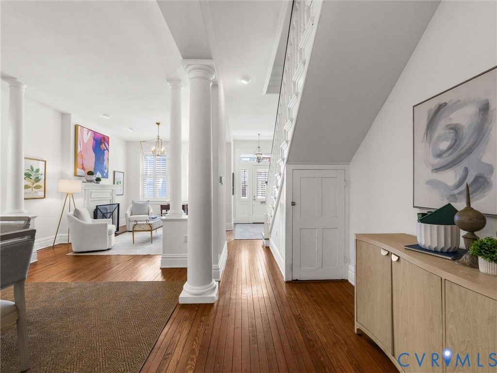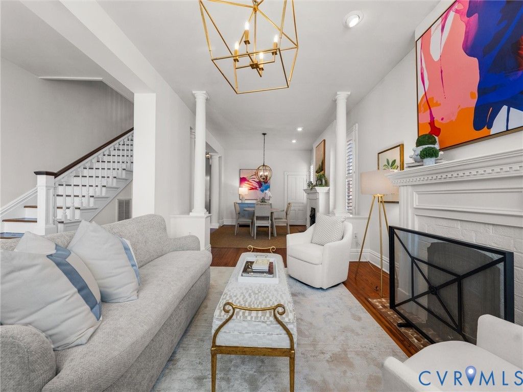 Bright and beautiful 3-bedroom, 2.5-bath Fan District rowhouse on sought-after Strawberry Street offering fresh interior paint, a modern updated kitchen, 10-foot ceilings, heart-of-pine floors, vintage moldings and fireplaces, plantation shutters, gas cooking and fireplaces, two-zone HVAC, double rear porches, and a wonderful front porch for outdoor living; the vaulted and spacious primary suite includes a private bath, while the third bedroom is currently opened to the upstairs hallway as a flexible office or workout space and can easily be converted back, plus basement storage and rare off-street parking for two cars, all in a prime Fan District location within walking distance to shopping, dining, and museums.