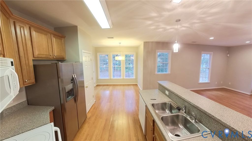 Discover this well-kept end-unit home featuring an open and welcoming layout. The bright and spacious living room is enhanced by large windows and a charming gas fireplace, flowing effortlessly into the kitchen with abundant cabinetry and granite-style countertops. The dining area opens to a private balcony with views of mature trees, offering a peaceful spot for morning coffee or unwinding at the end of the day. The roomy primary bedroom includes several windows, a walk-in closet, and a full en-suite bathroom with double sinks. A second bedroom, another full bath, and convenient in-unit laundry provide added comfort and practicality. Ideally situated close to shopping, dining, hospitals, Short Pump Mall, and more, this home combines privacy and accessibility, with a balcony that faces the woods for complete tranquility.
