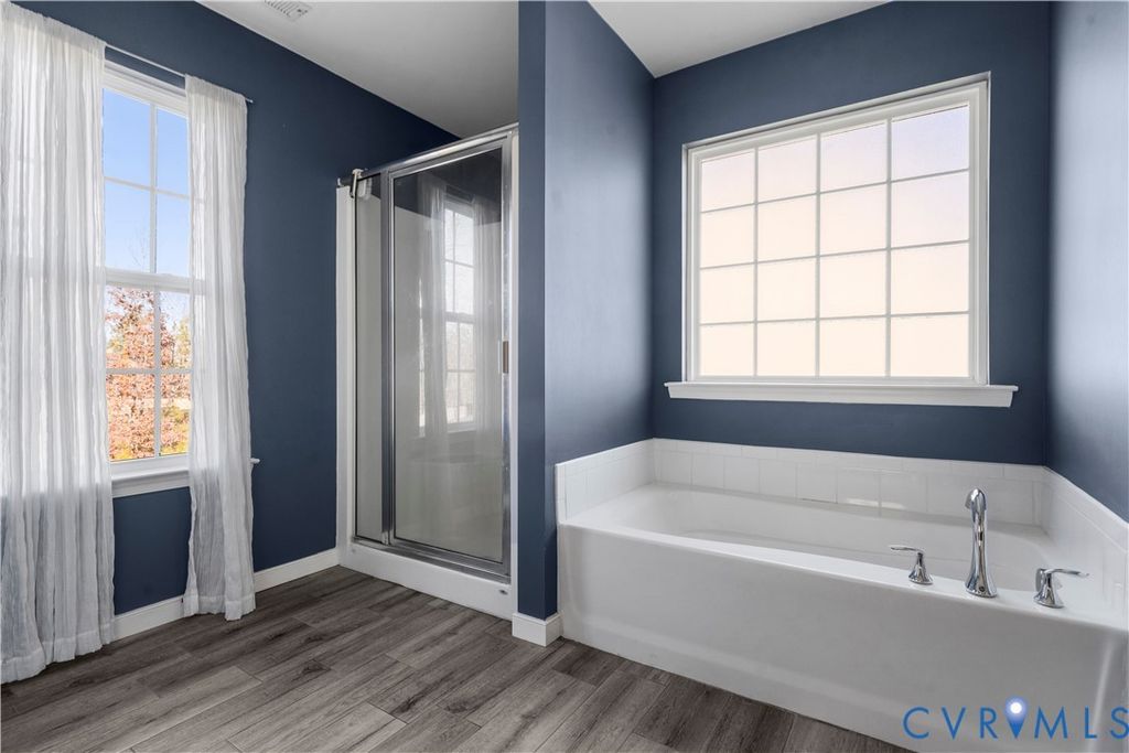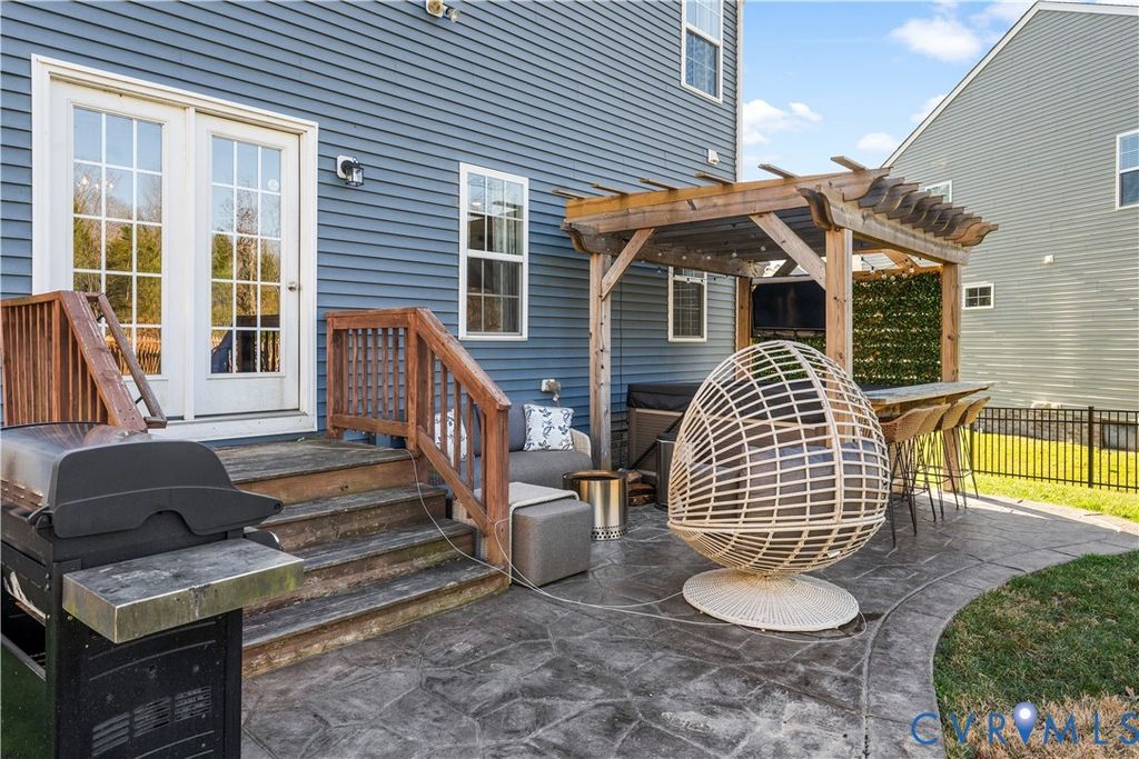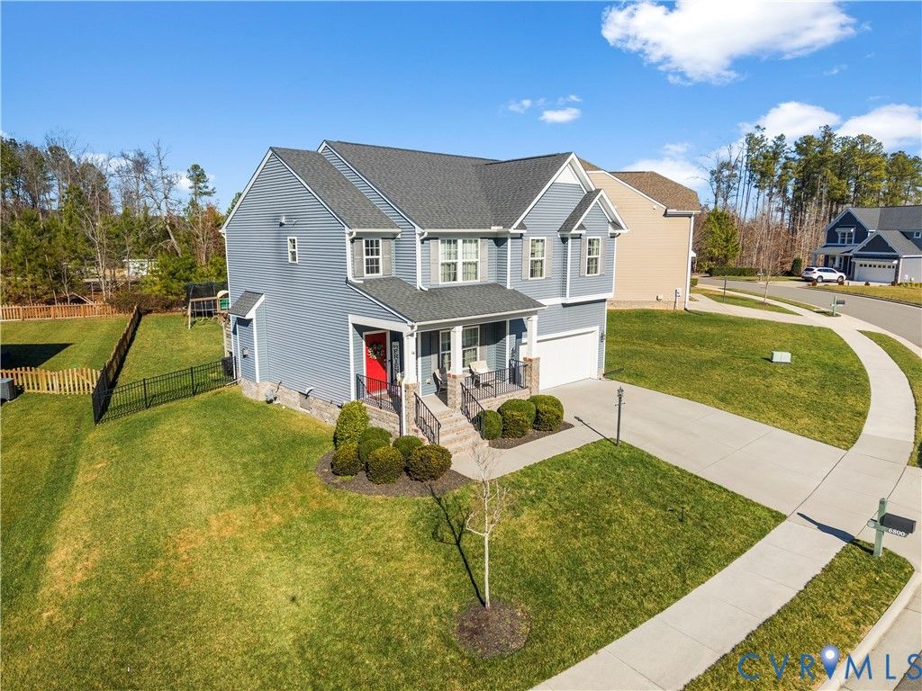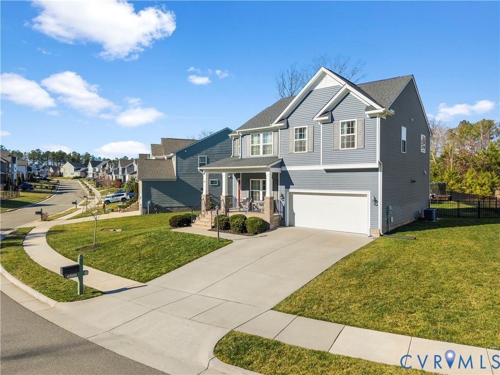 Welcome to 6800 Stafford Park Drive, a well appointed two story home in the highly sought after Magnolia Green community. Built in 2017, this 3 bedroom, 2.5 bath home offers 2,226 square feet of thoughtfully designed living space with a functional layout and timeless finishes. The main level features beautiful hardwood floors and abundant natural light throughout. A dedicated office with a tray ceiling provides an ideal work from home space, while the spacious living room is complemented by a gas fireplace and a wood paneled accent wall. This show-stopping kitchen blends timeless finishes with bold design, featuring white shaker cabinets and rich blue accent walls. The oversized island with seating is adorned with wood paneling and illuminated by modern pendant lighting, creating an inviting focal point. The space is complete with SS appliances, a gas range with a custom vent hood, a classic subway tile backsplash, and a spacious walk-in pantry, making it both stylish and highly functional. Upstairs, the primary suite includes an en-suite bath with a double vanity, garden tub, separate shower, and multiple closets. Two additional bedrooms with ample closet space and carpet share a full hall bath with a tub/shower combo and large vanity. A versatile loft space with carpet and recessed lights offers additional living space. The laundry area includes a front loading washer and dryer, a wood countertop for folding, and shelving for storage. Additional highlights include two-zone heating and cooling, a tankless water heater, and an attached two-car garage. The fenced backyard with a patio and pergola provide outdoor flexibility, while community amenities include pools, clubhouse, golf course, tennis courts, playgrounds, and walking trails. Get ready for a lifestyle upgrade in a premier community known for its amenities, top schools, and active environment, making it ideal for anyone seeking convenience and a vibrant neighborhood feel.