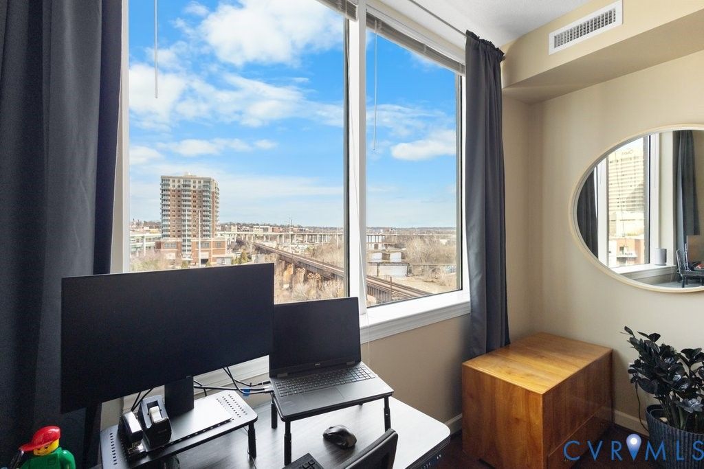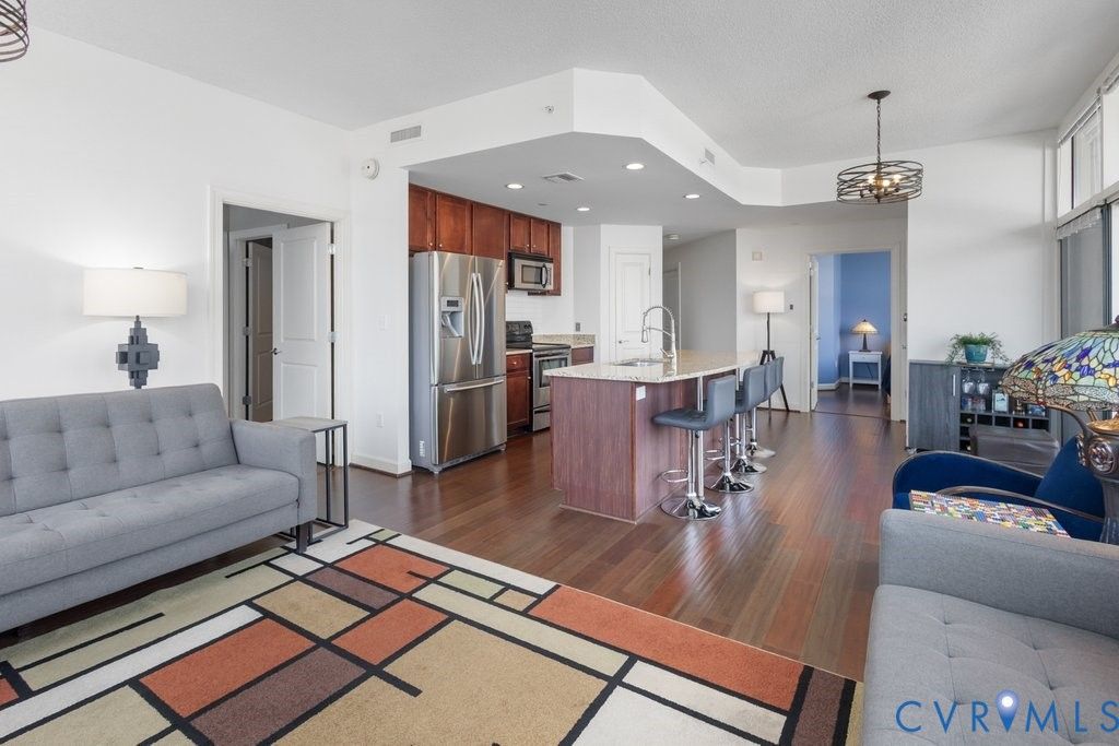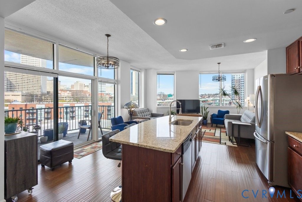 Perched on the 6th floor, this freshly painted corner residence offers city living at its finest with sweeping skyline and James River views. Highly sought-after corner-unit placement provides abundant natural light through floor-to-ceiling windows, a wall of glass along the living area, and a private balcony accessible by sliding doors. The primary bedroom also features expansive windows to capture the stunning scenery. The kitchen is appointed with granite countertops and stainless steel appliances, all of which convey, along with the convenient full size washer and dryer located in the laundry area. Generous closet space, plus a balcony storage room provide ample room for all your storage needs.This spacious condo includes two garage parking spaces (89 & 71), one located especially close to the building entrance. The garage also offers designated areas for storing kayaks, canoes, and bicycles. Residents enjoy secure, maintenance-free living with key fob access to the building and garage, and secured mail and package delivery inside the lobby. Community amenities on the second floor include a club room with a full kitchen for entertaining and a fitness center overlooking the James River. Pet-friendly (up to two pets with a combined 30 lb limit), the building also features a convenient pet station within the secured garage. Located just steps from the Canal Walk and overlooking the revitalized power plant"”now home to The Padel Plant featuring padel, pickleball, and social spaces"”this prime downtown location offers quick access to major highways and is just minutes from the airport. Enjoy luxury, low-maintenance living"”simply lock and go!