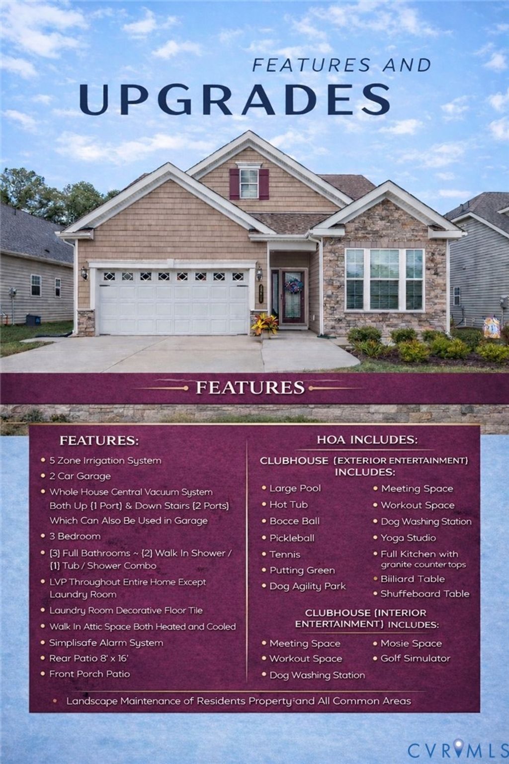 Move right into this beautifully maintained, move-in-ready Betsey Ross-style home offering outstanding value in one of Chesterfield's premier 55+ resort-style communities. Skip the wait and rising construction costs"”your next chapter starts today. This upgraded Betsey Ross model features multiple premium enhancements, thoughtfully designed for everyday comfort and effortless entertaining. A built-in central vacuum system adds convenience throughout. The open-concept floor plan showcases 9-foot ceilings and a spacious extended patio"”ideal for outdoor relaxation. Warm, inviting, and impeccably cared for, this home truly stands out. The chef's kitchen is a showpiece, complete with granite countertops, tile backsplash, black stainless steel fingerprint-resistant appliances, and custom lighting. The expansive great room impresses with a dramatic cathedral ceiling, creating an airy and elegant gathering space. Retreat to the private primary suite featuring a tray ceiling, walk-in closets, upgraded luxury vinyl plank flooring, and a beautifully appointed ensuite bath with double vanity, comfort-height fixtures, and a spacious shower. Every detail has been meticulously upgraded, including custom lighting, a climate-controlled HVAC system, and a companion irrigation meter for cost-saving efficiency. The garage is equally impressive with Trax custom flooring and a pegboard storage wall"”perfect for organization and functionality. Set within a beautifully maintained 104-acre community near Midlothian and Route 288, residents enjoy low-maintenance living with exceptional amenities: pickle ball courts, golf simulator, yoga studio, dog park, wine lounge, scenic walking trails, and a heated pool"”all curated by a full-time lifestyle director. This is more than a home"”it's a lifestyle upgrade.