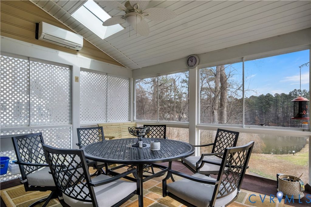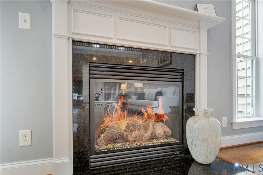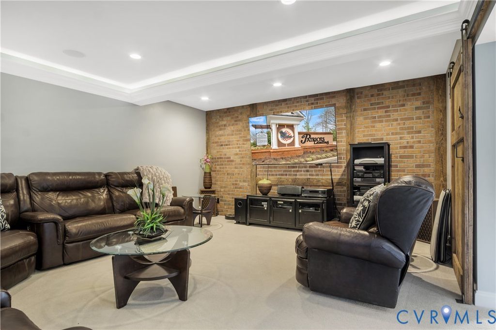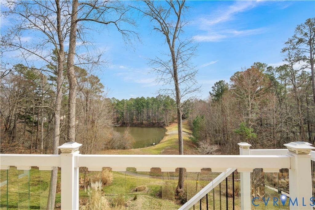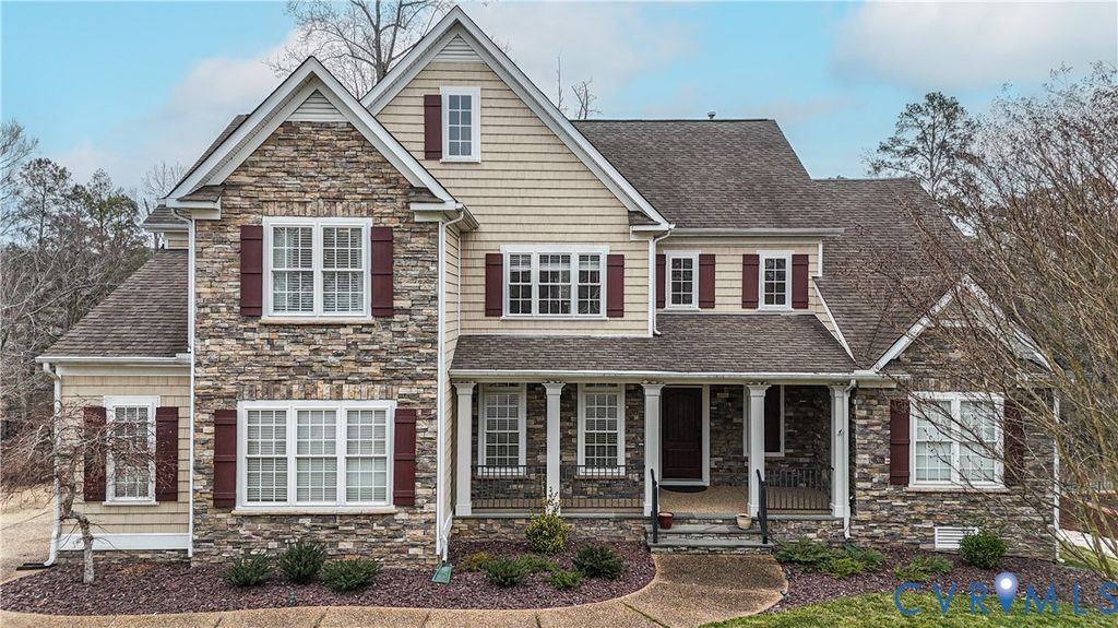 Stepping into this beautifully maintained home, you're immediately welcomed by rich hardwood floors and a grand two-story family room where sunlight pours through an impressive wall of windows. A warm gas fireplace anchors the space, while graceful columns subtly frame the generous dining area enhanced by crown molding, recessed lighting, and a tray ceiling. The flow carries naturally into a bright breakfast nook with bay windows and a well-appointed kitchen featuring granite counters, a gas cooktop, wall oven, and abundant cabinetry. An ideal hub for gathering and everyday living. Just beyond, a comfortable sitting area invites you to unwind beside a second gas fireplace. Its cathedral ceiling opens toward the balcony above, and large windows draw your eye out to the screened porch and peaceful wooded backdrop. The first-floor primary suite offers a quiet retreat with a tray ceiling, spacious walk-in closet, and marble floor bath with jetted tub, custom shower, and dual vanity. Upstairs, five additional bedrooms, including an ensuite bedroom, provides privacy for guests, while another bedroom is brightened by a bank of windows. A flexible office or playroom with French doors and hardwood flooring connects to a shared full bath and an additional bedroom. A loft overlooks both the foyer and family room, and a walk-up storage room adds everyday convenience. The fully finished walk-out basement expands this home's multigenerational appeal with modern lighting set into a tray ceiling, a brick accent wall, a full kitchen with quartz counters and farmhouse sink, a spacious guest room, full bath, and ample storage. Step outside to the covered patio and take in the serene wooded view and Patriot Lake. Low HOA Dues and centrally located between Richmond and Williamsburg! Amenities Include Pool, Clubhouse, Lake and Walking Trails. An exceptional setting that makes this home truly unforgettable!