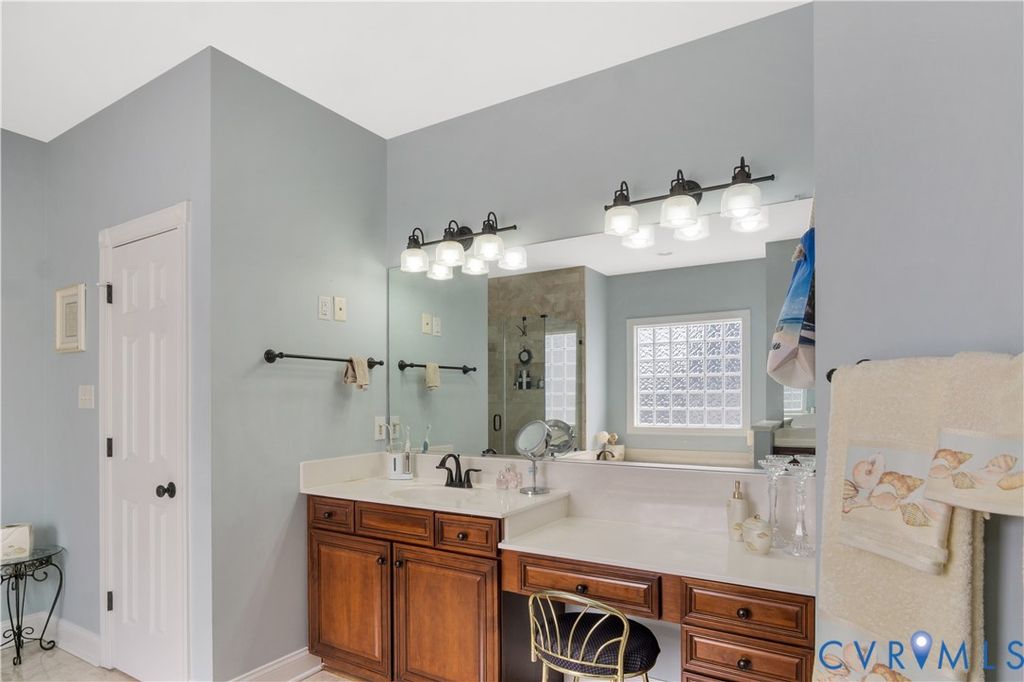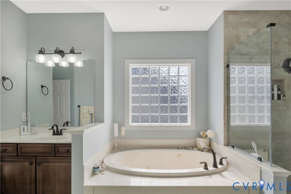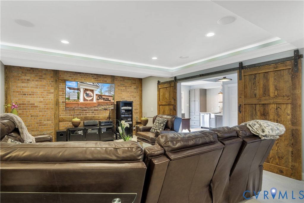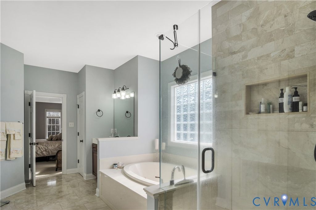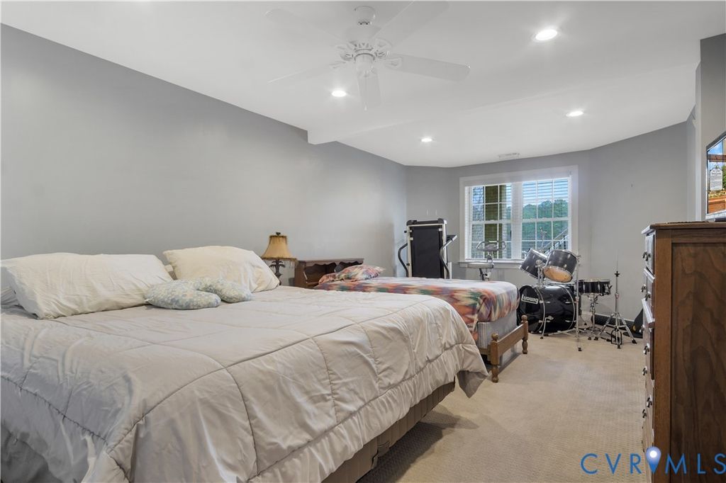 Stepping into this beautifully maintained home, you're immediately welcomed by rich hardwood floors and a grand two-story family room where sunlight pours through an impressive wall of windows. A warm gas fireplace anchors the space, while graceful columns subtly frame the generous dining area enhanced by crown molding, recessed lighting, and a tray ceiling. The flow carries naturally into a bright breakfast nook with bay windows and a well-appointed kitchen featuring granite counters, a gas cooktop, wall oven, and abundant cabinetry. An ideal hub for gathering and everyday living. Just beyond, a comfortable sitting area invites you to unwind beside a second gas fireplace. Its cathedral ceiling opens toward the balcony above, and large windows draw your eye out to the screened porch and peaceful wooded backdrop. The first-floor primary suite offers a quiet retreat with a tray ceiling, spacious walk-in closet, and marble floor bath with jetted tub, custom shower, and dual vanity. Upstairs, five additional bedrooms, including an ensuite bedroom, provides privacy for guests, while another bedroom is brightened by a bank of windows. A flexible office or playroom with French doors and hardwood flooring connects to a shared full bath and an additional bedroom. A loft overlooks both the foyer and family room, and a walk-up storage room adds everyday convenience. The fully finished walk-out basement expands this home's multigenerational appeal with modern lighting set into a tray ceiling, a brick accent wall, a full kitchen with quartz counters and farmhouse sink, a spacious guest room, full bath, and ample storage. Step outside to the covered patio and take in the serene wooded view and Patriot Lake. Low HOA Dues and centrally located between Richmond and Williamsburg! Amenities Include Pool, Clubhouse, Lake and Walking Trails. An exceptional setting that makes this home truly unforgettable!