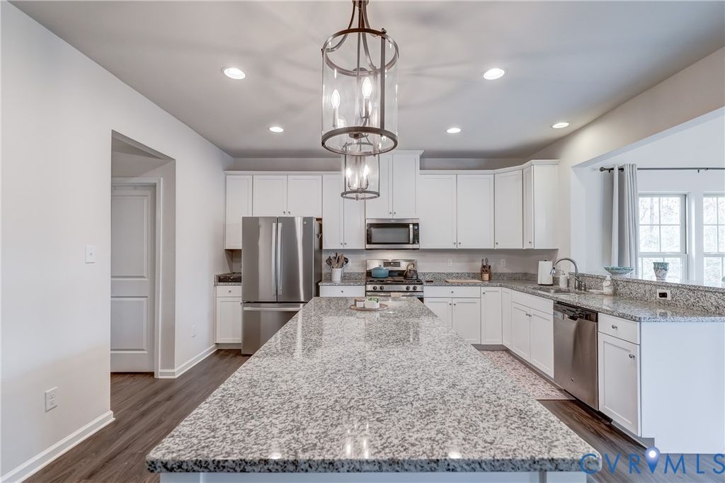 Wow!!! Get ready to move into your spacious 5 bedroom 3.5 bath home in the sought after Arbors at New Kent Winery. This stunning home features so many must haves. Large hardwood floored family room with stacked stone gas fireplace off the beautiful kitchen with granite counter tops, stainless appliances, massive granite center island with bar seating, shaker cabinets, recessed lighting, large walk-in pantry and gas cooking. Entertain in your hardwood floored formal dining room and living room just off the foyer with beautiful half bath. Enjoy some quiet in your private 1st floor office with workstation. Bright and roomy morning room off the kitchen with convenient rear deck access for grilling/relaxing. Heading upstairs you'll definitely be able to unwind in your huge 23.4x22.1 primary bedroom with in-suite full bath complete with dual vanities, tiled shower and two separate large walk-in closets. Ample room for family or guests in the additional large three bedrooms and hall tiled full bath. The finished basement has an awesome 40.2x17.9 carpeted recreation room, fifth bedroom, full bath, large storage area and direct access to the covered rear patio. The rear yard features a stone walk way to a firepit and metal fencing. The two car attached garage provides direct access to the home to keep you out of the elements or park in the double width drive. This home has it all!!!
