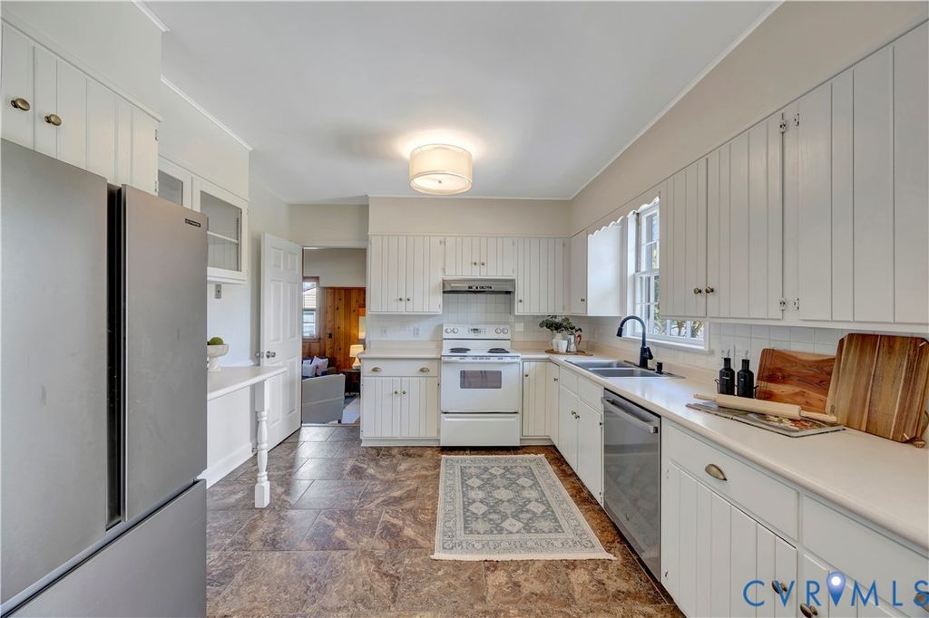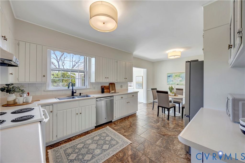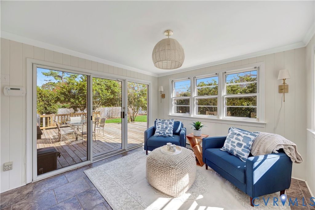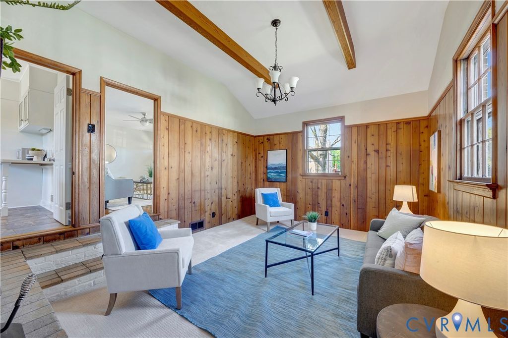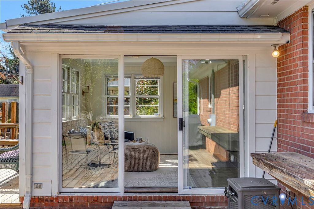 This beautifully maintained 3-bedroom, 2-bath brick ranch offers spacious living just minutes from downtown, Stony Point, Midlothian, the popular South of the James Farmers Market, and the James River. Inside, you'll find expansive living areas including a large living room, kitchen, den, and a stunning family room featuring a beamed vaulted ceiling and wood-burning stove. Hardwoods run throughout, and each bedroom offers generous closet space. New carpet has been installed in the sunken den. The updated primary bath has been fully renovated, and the guest bath has been refreshed. Additional recent improvements include a new deck (2024), new refrigerator (2023), new dishwasher (2024), new water heater (2025), encapsulated crawl space, insulated attic, chimney swept with new wood stove vent, and new shelving, cabinetry, and flooring in the laundry/mudroom. Enjoy outdoor living in the large, private backyard featuring a brand-new firepit, refreshed raised garden beds, and an oversized deck with built-in seating. The bright sunroom overlooks this inviting outdoor space- perfect for relaxing or entertaining. Move-in ready with thoughtful updates throughout- don't miss this one!