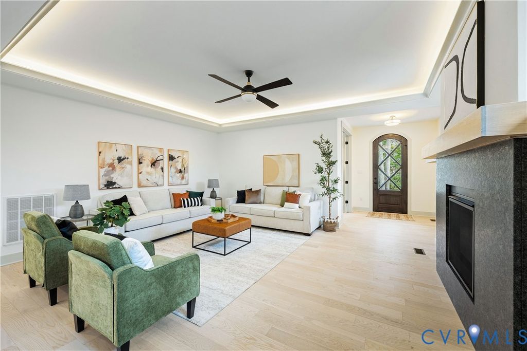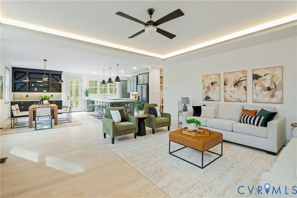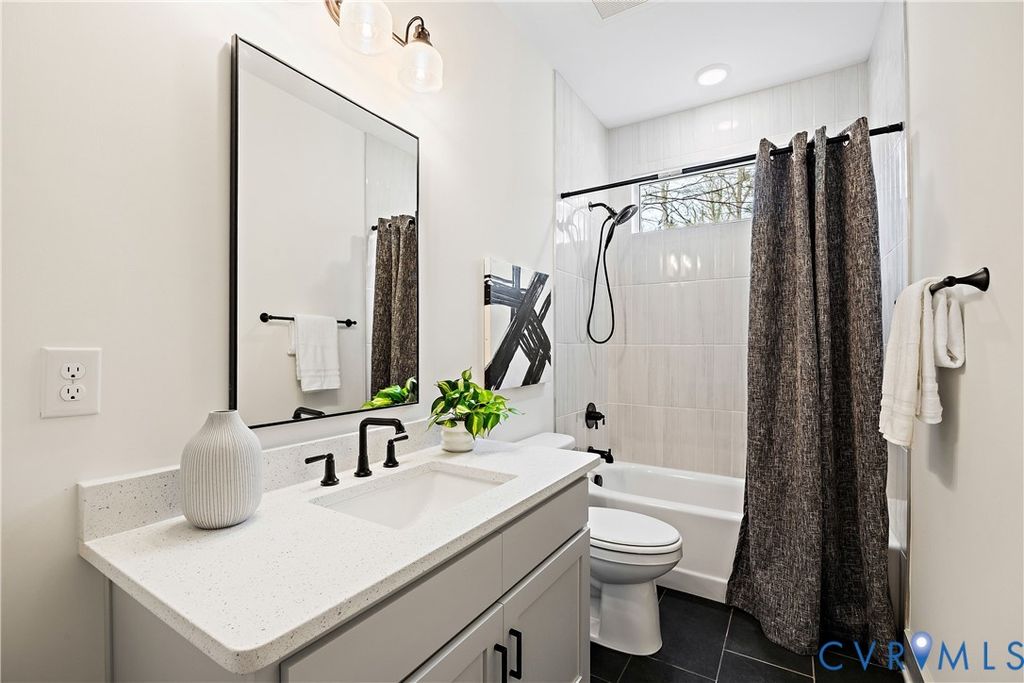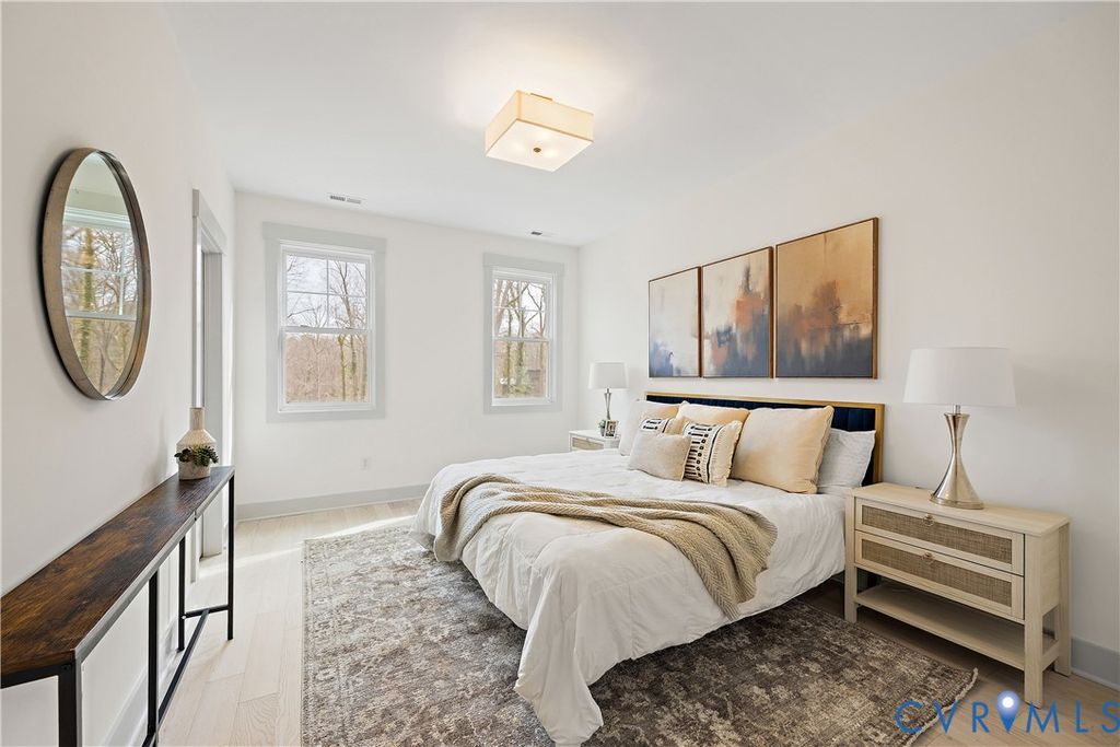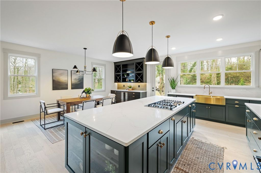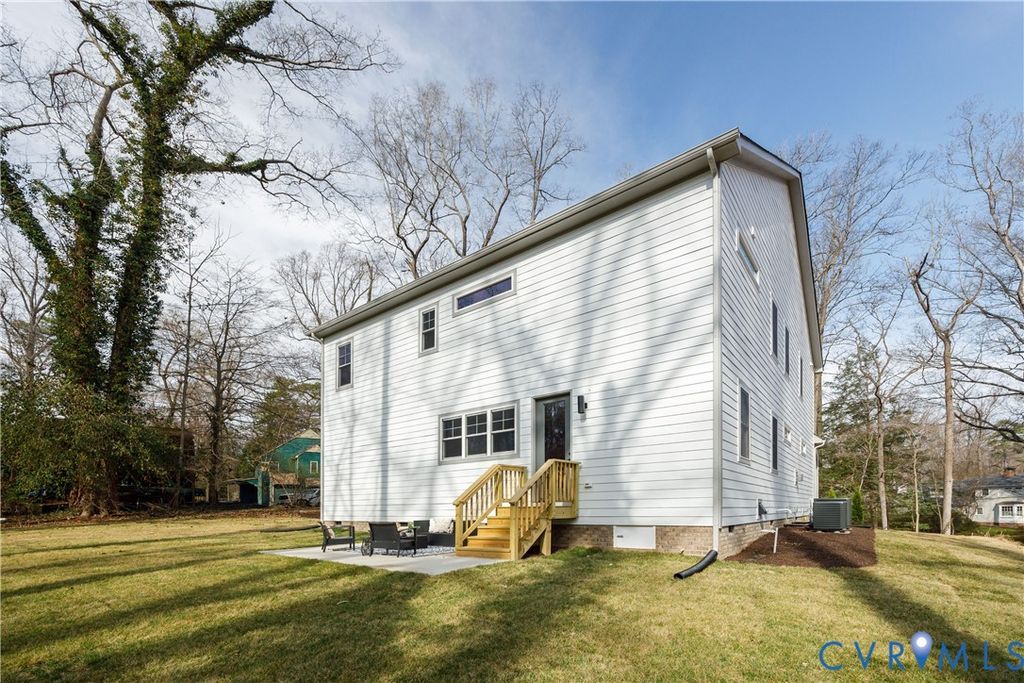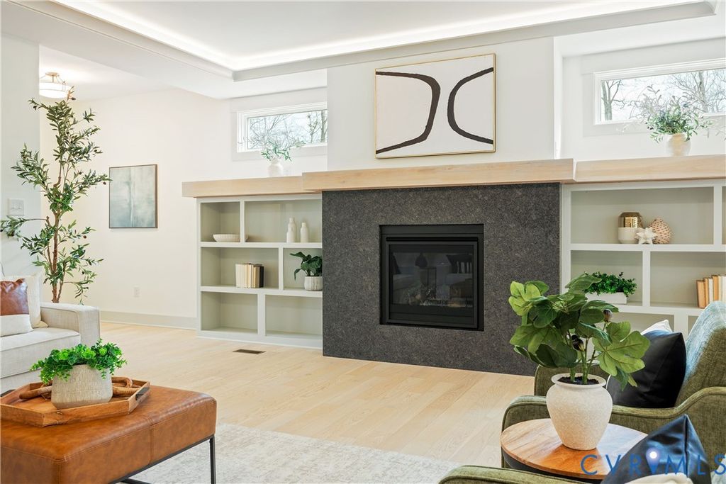 Set on a quiet, tree-lined street just off Cherokee Road, this striking Tudor-inspired home blends timeless architecture with modern luxury. Built by Richmond Hill Design, this newly constructed custom home offers 4 bedrooms, 3 full baths, and 3,131 square feet of thoughtfully designed living space. The striking exterior showcases European charm with clean architectural lines, stone accents, classic Tudor details, an arched entry & arched front door, and a steep-pitched roofline that creates unforgettable curb appeal. Inside, engineered hardwood floors run throughout the home. To the right of the foyer, a private office features French doors and a stylish accent wall. The open main living area includes a family room with a gas fireplace with a natural stone surround and custom built-ins. Adjacent to the family room is a dining area with a built-in bar complete with wine racks, cabinetry, quartz countertop and a wine fridge. The living spaces flow seamlessly into the stylish kitchen, featuring custom green shaker-style cabinetry, champagne brass farm house sink, quartz countertops with quartz backsplash, gas cooking, an appliance garage, pull-out spice rack & utensil storage, brass hardware and a walk-in pantry. The first floor also includes a drop zone off the garage, a guest bedroom, and a full hall bath. Upstairs, you'll find a loft area and the spacious primary suite. The spa-like primary bath offers a large walk-in shower with multiple shower heads, a bench, seamless glass enclosure, dual vanity, linen closet, and private water closet. The bath connects to a large walk-in closet with a center island topped with quartz. Two additional bedrooms, a full hall bath with dual vanity, a laundry room with built-in shelving, and walk-in storage complete the second floor. The yard is fully irrigated & has a patio perfect for summer grilling. This home is also conveniently located near shopping, coffee shops, walking trails such as Larus Park & walkable to the James River.
