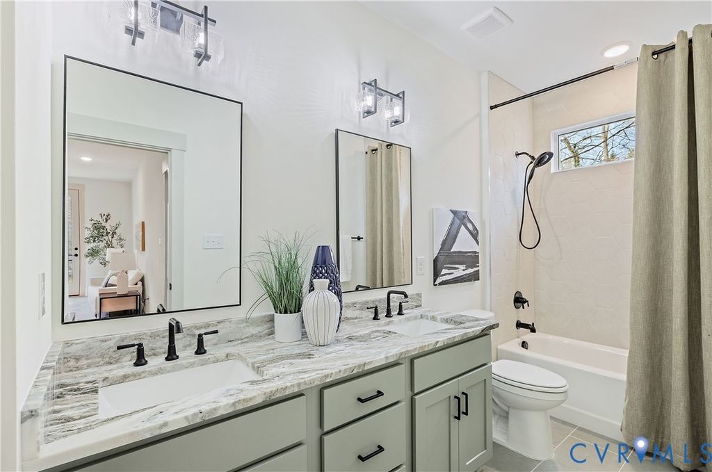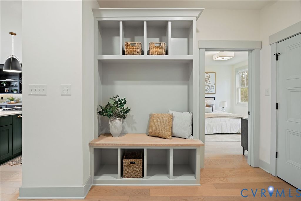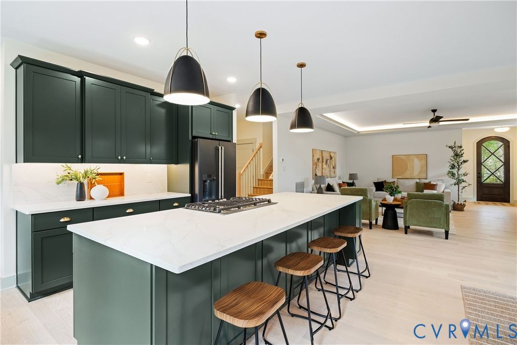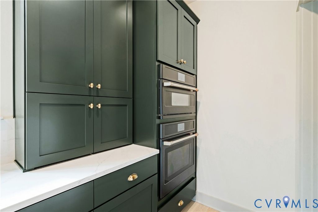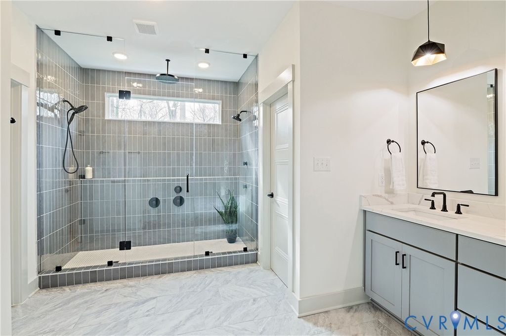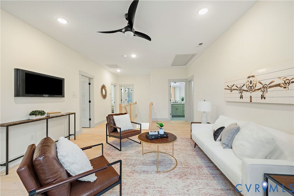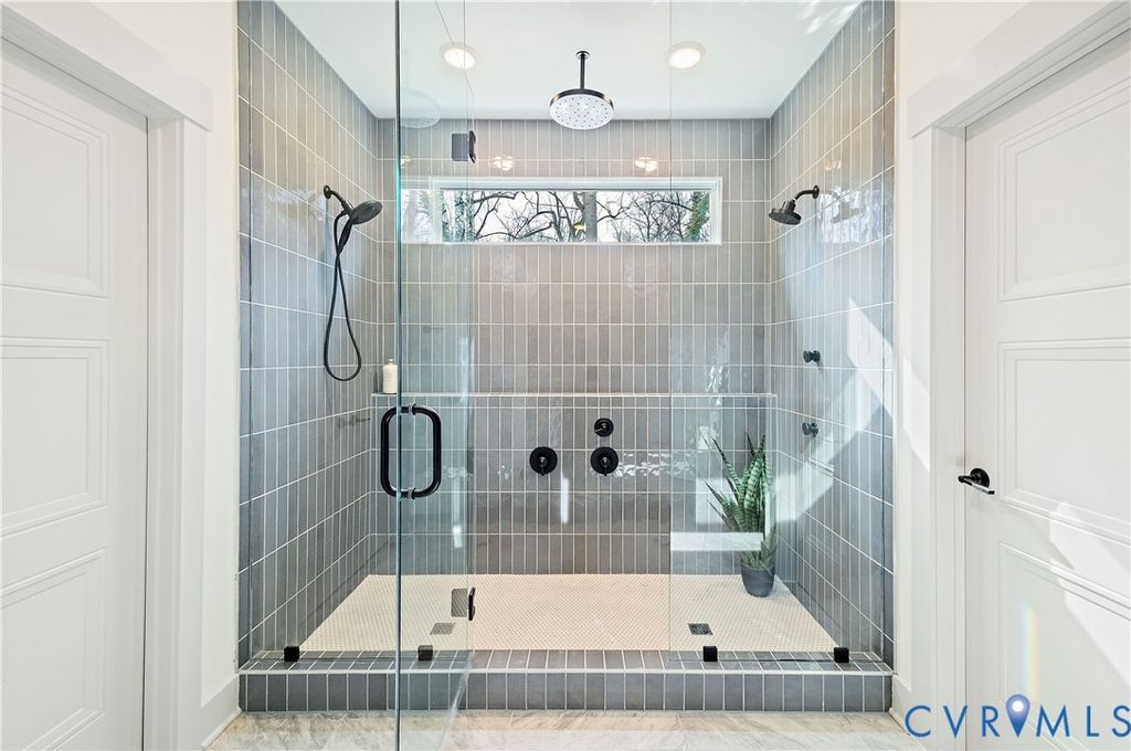 Set on a quiet, tree-lined street just off Cherokee Road, this striking Tudor-inspired home blends timeless architecture with modern luxury. Built by Richmond Hill Design, this newly constructed custom home offers 4 bedrooms, 3 full baths, and 3,131 square feet of thoughtfully designed living space. The striking exterior showcases European charm with clean architectural lines, stone accents, classic Tudor details, an arched entry & arched front door, and a steep-pitched roofline that creates unforgettable curb appeal. Inside, engineered hardwood floors run throughout the home. To the right of the foyer, a private office features French doors and a stylish accent wall. The open main living area includes a family room with a gas fireplace with a natural stone surround and custom built-ins. Adjacent to the family room is a dining area with a built-in bar complete with wine racks, cabinetry, quartz countertop and a wine fridge. The living spaces flow seamlessly into the stylish kitchen, featuring custom green shaker-style cabinetry, champagne brass farm house sink, quartz countertops with quartz backsplash, gas cooking, an appliance garage, pull-out spice rack & utensil storage, brass hardware and a walk-in pantry. The first floor also includes a drop zone off the garage, a guest bedroom, and a full hall bath. Upstairs, you'll find a loft area and the spacious primary suite. The spa-like primary bath offers a large walk-in shower with multiple shower heads, a bench, seamless glass enclosure, dual vanity, linen closet, and private water closet. The bath connects to a large walk-in closet with a center island topped with quartz. Two additional bedrooms, a full hall bath with dual vanity, a laundry room with built-in shelving, and walk-in storage complete the second floor. The yard is fully irrigated & has a patio perfect for summer grilling. This home is also conveniently located near shopping, coffee shops, walking trails such as Larus Park & walkable to the James River.