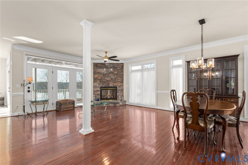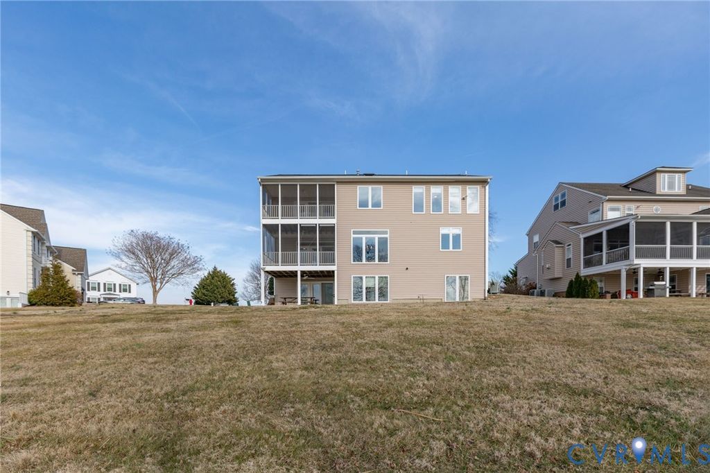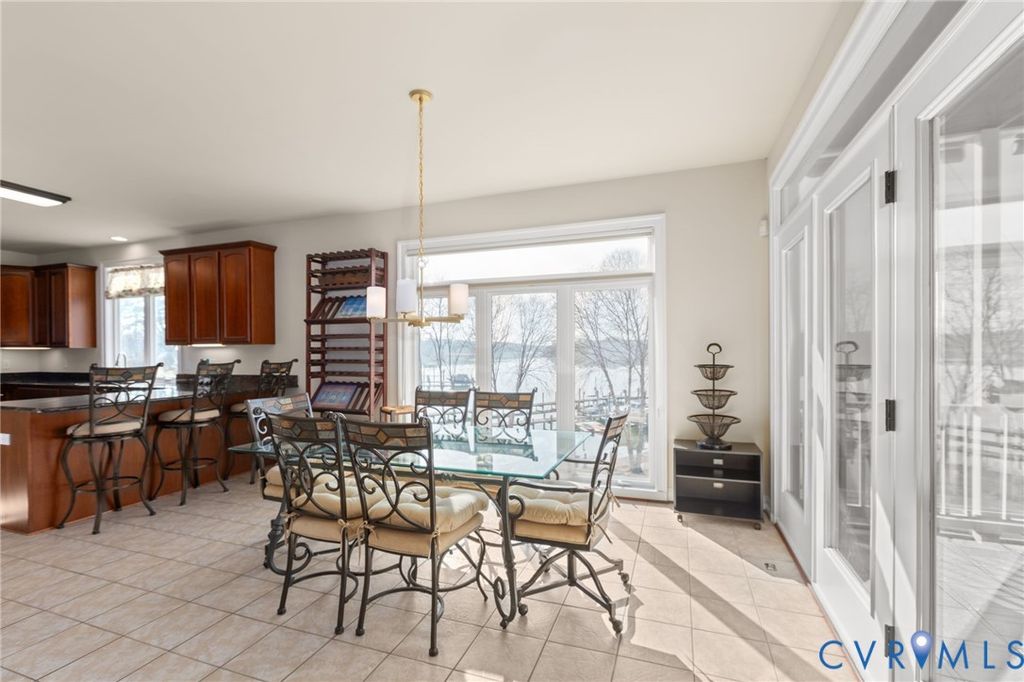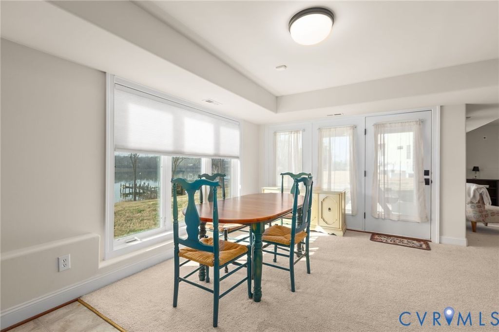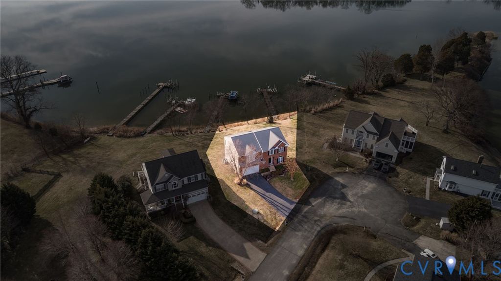 Imagine you're at home surrounded by water views, watching a bald eagle fly to its nest, you're preparing the boat for an outing, or maybe just fishing the dock with legs dangling towards the water. Welcome to Shellfield Shores where gorgeous sunrises and awe-inspiring sunsets are a potential every day in those dreams. The home boasts 3,439 square feet of living space, a large two car garage, a back porch on each of the upper levels and a great space to grill and fill right out the basement doors. The main level consists of a large kitchen w/ granite countertops, and a large gas cook-stove & hood, and plentiful pantry and cabinet space. Adjacent kitchen is an eat-in dining area which flows into the living room, and both overlook the Rosier Creek. The formal living space is graced with a gas fireplace for the cool months and opens onto the main deck, then additional open space is set for a formal dining with chandelier, and finally a half bath. In the upper chambers you'll find the large primary suite with spanning windows to provide epic views out towards the water, another large room for an office or sitting area and gas fireplace exiting onto the upper deck, plus two additional bedroom spaces, one of which is a potential connected sitting area to the primary. The primary bathroom is just beyond the double walk-in closets, boasting separate vanities, a large soaking tub, a large tiled roman shower, a linens closet, and a separate privy chamber. The second upper bathroom is tub/shower combination with linen closet, and lastly the main laundry room with washer & dryer has an additional large linens/storage closet. Down in the basement you'll discover two large bedrooms, a full bathroom, a rec room, and a dining space with a kitchenette including a mini-fridge, microwave and sink, the main living areas open up out onto the back patio. Down on the dock, you'll find electric outlets and it's replete with one electric boat lift, 2 lights to manage your path, a water spigot, and retractable river ladder.