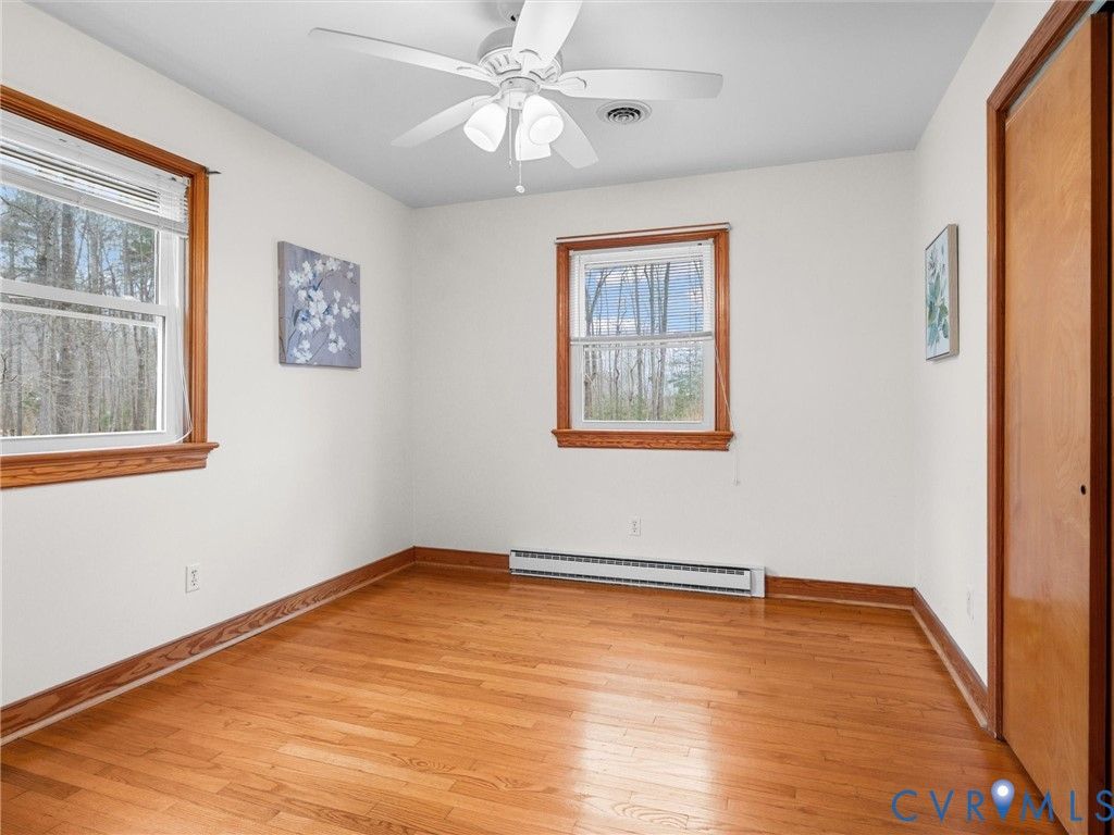 Well-maintained brick 3 bedroom/ one and 1/2 bathroom ranch on a level one-acre lot on a quiet street in Powhatan. One'level living 15 minutes from Midlothian and 288 on a quiet street. Hardwood floors throughout with the exception of the new LVP in the kitchen and half-bath. New tile backsplash and countertops in kitchen. Replacement windows throughout! Fresh paint in most rooms. There is a whole-house generator! The 1400 sq. ft. house is situated in the middle of a level lot with a paved driveway. Sheds have electricity and convey as/is. The irrigation system has not been used recently and conveys as/is.