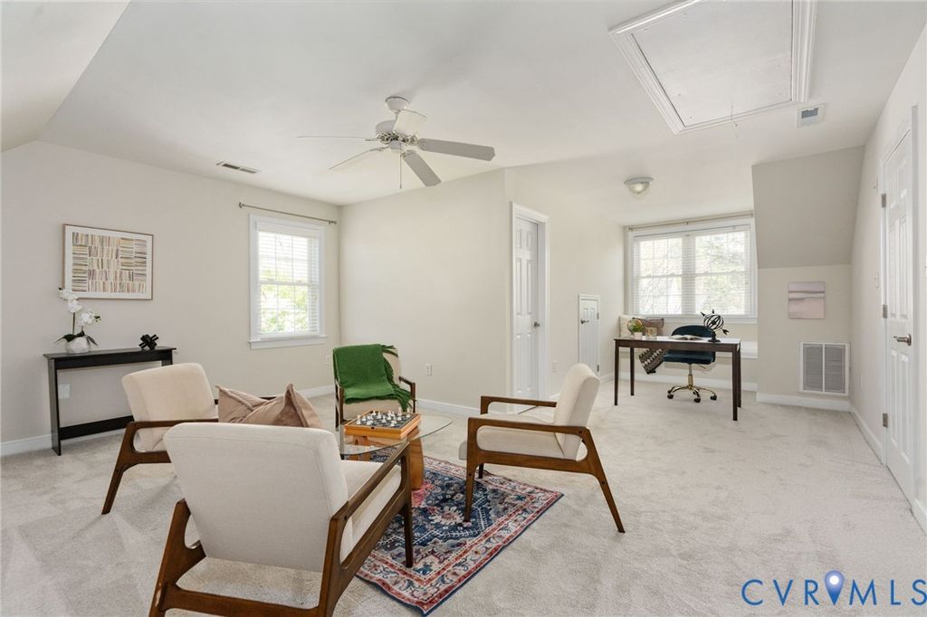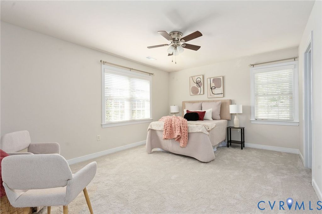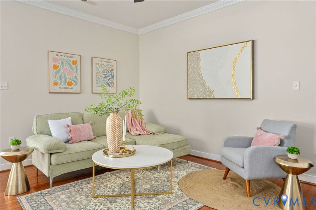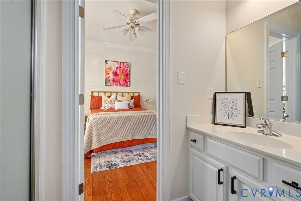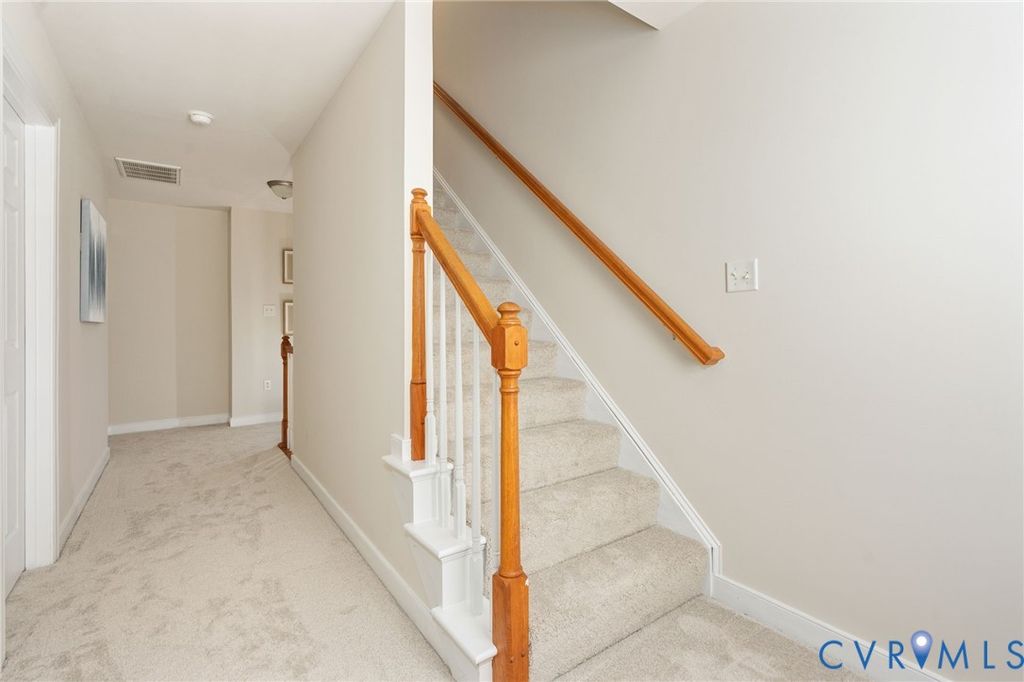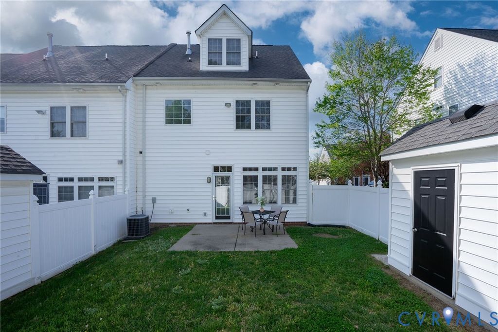 Welcome to this beautifully refreshed brick end-unit townhome offering a spacious and versatile layout. With four bedrooms and four full bathrooms, this home stands out as a rare find, delivering flexibility and functionality well beyond what you might expect. Freshly painted throughout in a soft neutral color and featuring brand-new carpet, the home feels bright, clean and move-in ready. The main level showcases hardwood floors, enhanced by crown molding and chair rail accents. The kitchen is thoughtfully updated with freshly painted white cabinets, a new range, stainless steel appliances, solid surface counters and sink, recessed lighting, and a striking stainless steel subway tile backsplash; all seamlessly connected to the dining area. The adjoining family room offers hardwood floors, crown molding, a ceiling fan, and a cozy gas fireplace, with access to a fenced backyard complete with a patio and storage shed. A standout feature is the main-level bedroom or study with its own private ensuite bath, ideal for guests or a home office. Upstairs, the primary suite features hardwood flooring, crown molding, decorative ceiling trim, a walk-in closet, and an ensuite bath with tile flooring, soaking tub, and separate tile shower. A second bedroom on this level includes new carpet and its own private bath. The third floor adds even more versatility with an additional bedroom suite or multi-purpose living space, complete with new carpet, a cozy window bench seating area, and sloped ceilings that add architectural character, along with its own full bath. Additional features include 2-inch blinds throughout, two reserved parking spaces, and ample visitor parking. Bartley Pond's location can't be beat - minutes from Innsbrook or Short Pump, and quick access to I-64. With its end-unit setting, fresh updates, and rare four-bedroom/four-bath layout, this home offers both space and flexibility in a thoughtfully designed package.