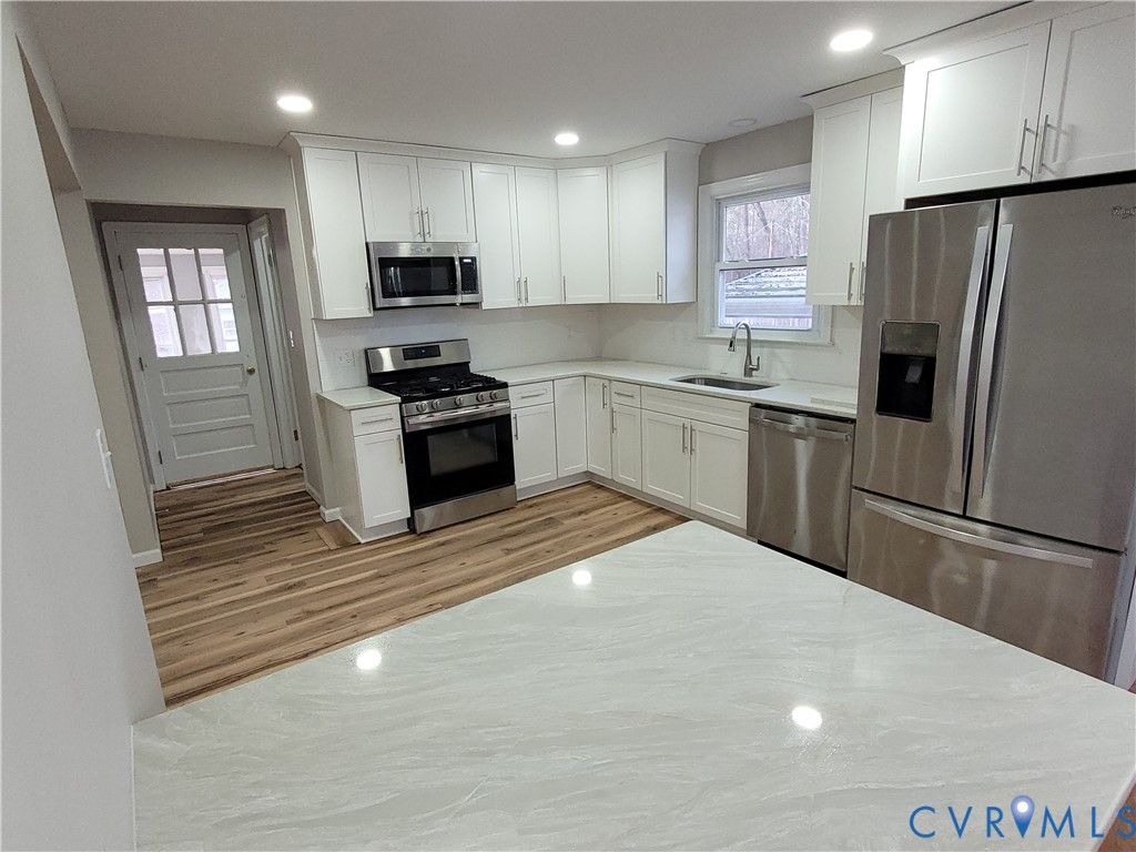 Come see this move-in ready, beautifully renovated brick rancher featuring 3 spacious bedrooms and 2 full bathrooms, perfectly situated on an over half of an acre lot with wide open space. No detail was overlooked in this renovation, where classic charm meets modern updates. Inside, you'll find refinished hardwood floors with a natural finish flowing through the home, paired with a completely refreshed interior. The stunning kitchen features waterproof luxury vinyl flooring, and offers soft-close cabinetry, a generous pantry, an oversized island and Level 5 quartz countertops with tiled backsplash, and a full stainless-steel appliance package"”perfect for everyday living and entertaining. This home features both a living room and a family room, providing plenty of space for gatherings and relaxing with family and friends. Both bathrooms have been thoughtfully updated. The main bath includes a stylish vanity, ceramic tile flooring, and a beautifully tiled tub/shower combination. The spacious owner's suite features a private en-suite bathroom with a double vanity and a tiled walk-in shower. Additional highlights include a dedicated laundry room, bright sun-room, and expansive yard space ideal for gardening, recreation, or outdoor entertaining. In the back yard, you will find a large concrete block utility building with electricity"”great for a workshop, storage, or hobby space. Conveniently located minutes from Fort Lee Army Base, major highways, shopping, and excellent dining, this home offers the perfect combination of quality craftsmanship, space, and modern comfort. Don't miss out on this great opportunity to own a like new home without the high sticker price! Don't miss the opportunity to own this beautifully renovated home. Schedule your showing today!