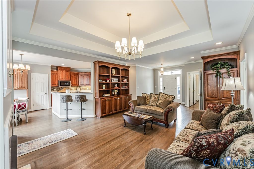 This elegant inspired Ranch home showcases timeless coastal architecture with graceful gabled rooflines. A welcoming front entry framed by transom windows and brick steps sets the tone for the home's refined character, while the wide exposed aggregate courtyard/driveway area and side-load garage enhance both function and curb appeal. The interior of the home welcomes you with a bright, open foyer highlighted by flawless refinished hardwood flooring and elegant crown molding, creating an immediate sense of warmth and sophistication. Just beyond, the thoughtfully designed floor plan opens to spacious living areas filled with natural light. The great room features a stunning tray ceiling and an electric fireplace framed by classic millwork and beautifully crafted built-in cabinetry. Spacious Florida Room with large windows and French doors invites the outdoors in while maintaining the home's airy, light-filled atmosphere. The kitchen is both stylish and functional, featuring abundant warm-wood cabinetry, solid-surface countertops, Jenn-Air appliances, a tile backsplash, and a convenient breakfast bar. A sunny breakfast nook surrounded by large windows provides the perfect spot, featuring NEW remote-controlled blinds for enjoying the view of the landscaped yard. The formal dining room offers vaulted ceilings, chair rail detailing, and a graceful arched window. Thoughtful split bedroom design features a spacious First Floor Primary Suite with 2 WIC and a deluxe owner's bath with separate dual vanities and tile shower. 2 other secondary Bedrooms, both complete with spacious closets and a full bath. The 4th Bedroom/Bonus Room is over the garage and features a spacious closet and expansive walk-in attic. Stunning chandeliers add touches of elegance throughout the home, All New Paint, Capreting, NEW HVAC and NEW Gas Water Heater with transferable warranties, New Fixtures, New Kitchen backspalsh and updated powder room. Conditioned Crawlspace too. You do not want to miss this one.