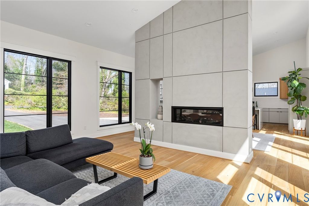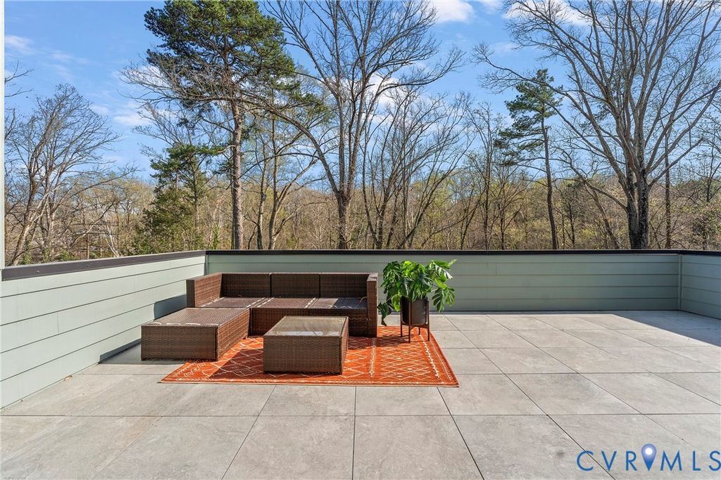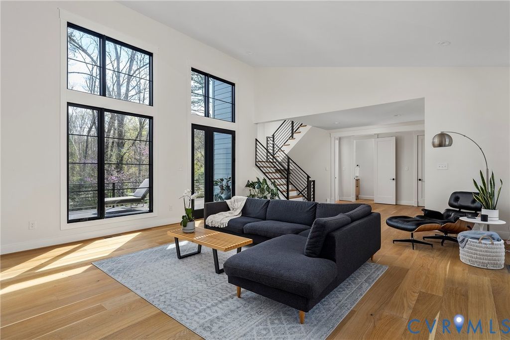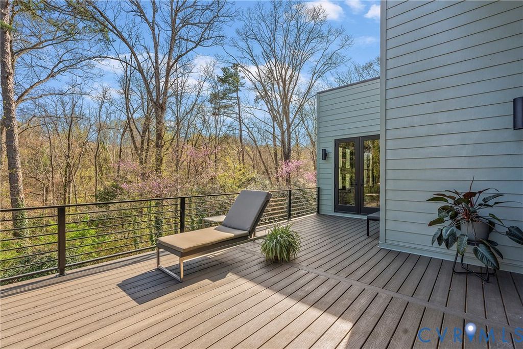 Architecturally striking and filled with natural light, this modern retreat sits just steps from Pony Pasture along the James River on nearly an acre of wooded privacy. Set in a peaceful, natural setting, this home offers a rare combination of design, privacy, and convenience just minutes from the city. Designed with clean lines and filled with natural light, the home features 4 bedrooms and an open-concept layout with a seamless flow between living, dining, and kitchen spaces. The kitchen is a true focal point with sleek cabinetry, a large island, induction cooktop, and a warm mix of modern finishes carried throughout. Floor-to-ceiling windows and glass doors open to an expansive elevated deck, creating a private outdoor retreat surrounded by nature, perfect for entertaining or unwinding. A standout feature is the consistent 9-foot ceilings across all levels enhancing the home's airy feel. The lower level is fully finished and ideal for a home gym, recreation space, or additional living area. The primary suite is spacious and serene, complemented by a spa-like bathroom with a freestanding soaking tub and generous walk-in shower. Additional highlights include wide-plank hardwood floors, a dedicated office/flex space, and a thoughtfully designed exterior with mixed materials and contemporary appeal. A rare opportunity to own a modern home in one of Richmond's most desirable locations just moments from scenic trails, river access, and some of Richmond's best local dining.