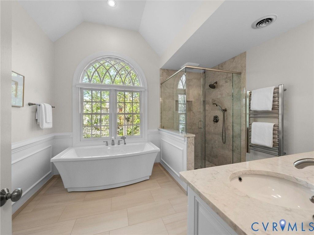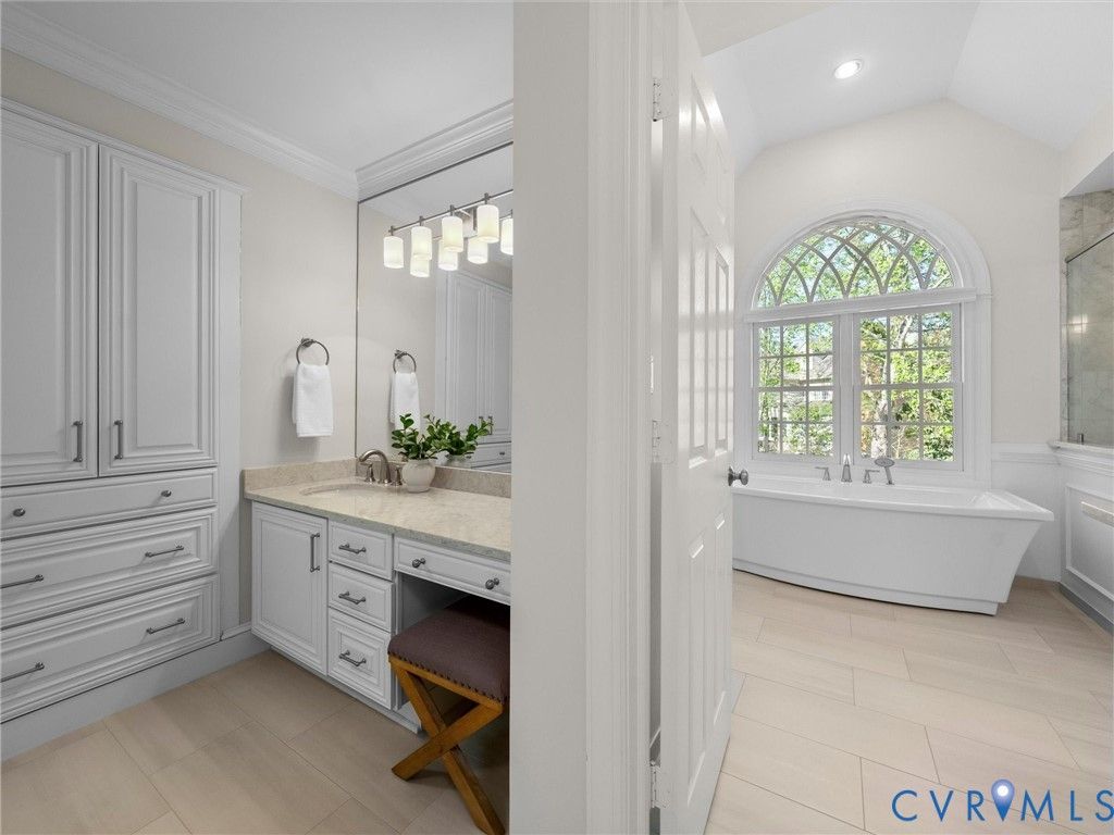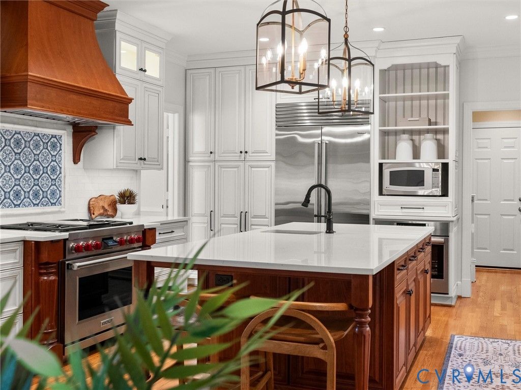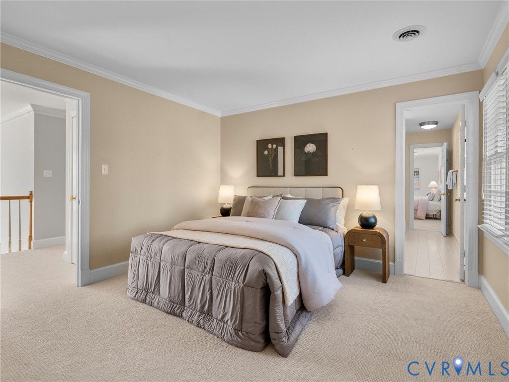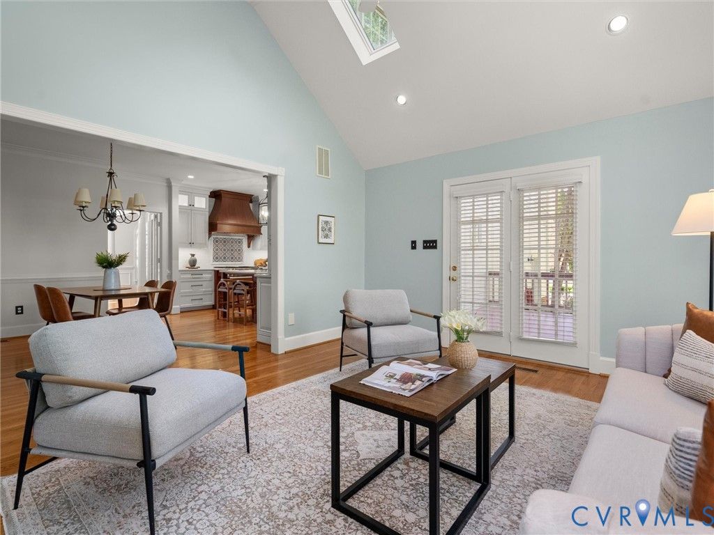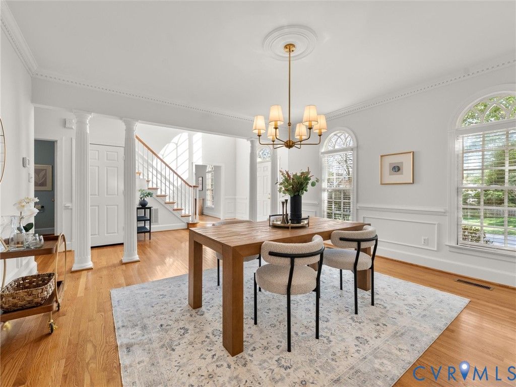 This stately renovated and meticulously maintained 5 bedroom, 4 ½ bath brick home is beautifully sited on an elevated flat lot in the sought-after Barrington neighborhood. The light-filled 2-story foyer with sweeping staircase opens to the formal living and dining rooms featuring timeless architectural details and newly refinished hardwood floors. Renovated in 2022 by Custom Kitchens, the chef's kitchen is a true focal point, thoughtfully designed with ample custom cabinetry, quartz island/counters and top-of-the-line stainless steel appliances including a Wolf gas range, SubZero refrigerator/freezer, convection wall oven, microwave and Bosch dishwasher. The kitchen opens to the breakfast room and a bright sunroom with vaulted ceiling and skylights.The spacious family room features a gas fireplace and custom-built bookcases. The first floor is completed by a drop zone with custom lockers off of the two-car garage - balancing this home's elegance with everyday practicality. French doors from the sunroom and family room seamlessly flow to the raised deck overlooking the landscaped yard with mature trees creating a private yet inviting setting for both quiet mornings and evening gatherings. Upstairs, you will find a total of five bedrooms and three full baths - including the luxurious primary suite with two walk-in closets and a newly renovated primary bath with double vanity, freestanding soaking tub, walk-in tiled shower, heated towel rack and heated floors. Three additional bedrooms, two full renovated baths, and a laundry room complete the second level. The third floor adds exceptional versatility with a large recreation room with vaulted ceiling and potential 6th bedroom with built-in workspace, walk-in closest plus a full bath. Significant updates include newer roof, newer aggregate driveway and walkway, newer HVAC systems and water heater. Ideally located just minutes from Short Pump's premier shopping and dining, top-rated schools, and major highways, this home is truly move-in ready!