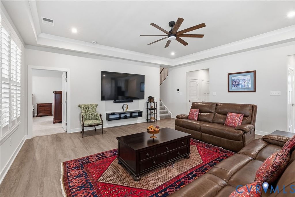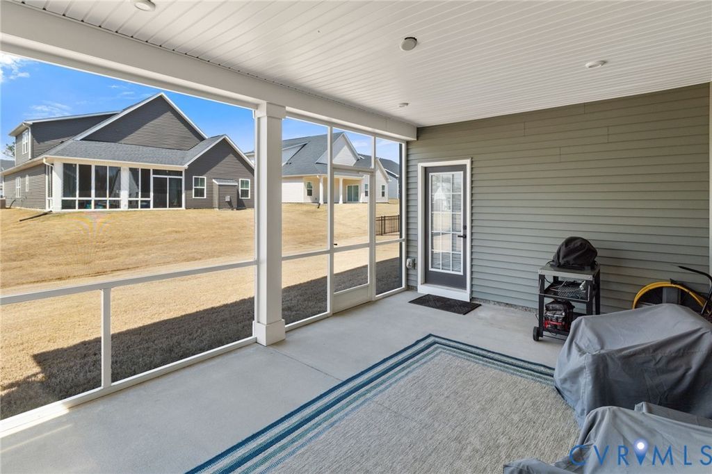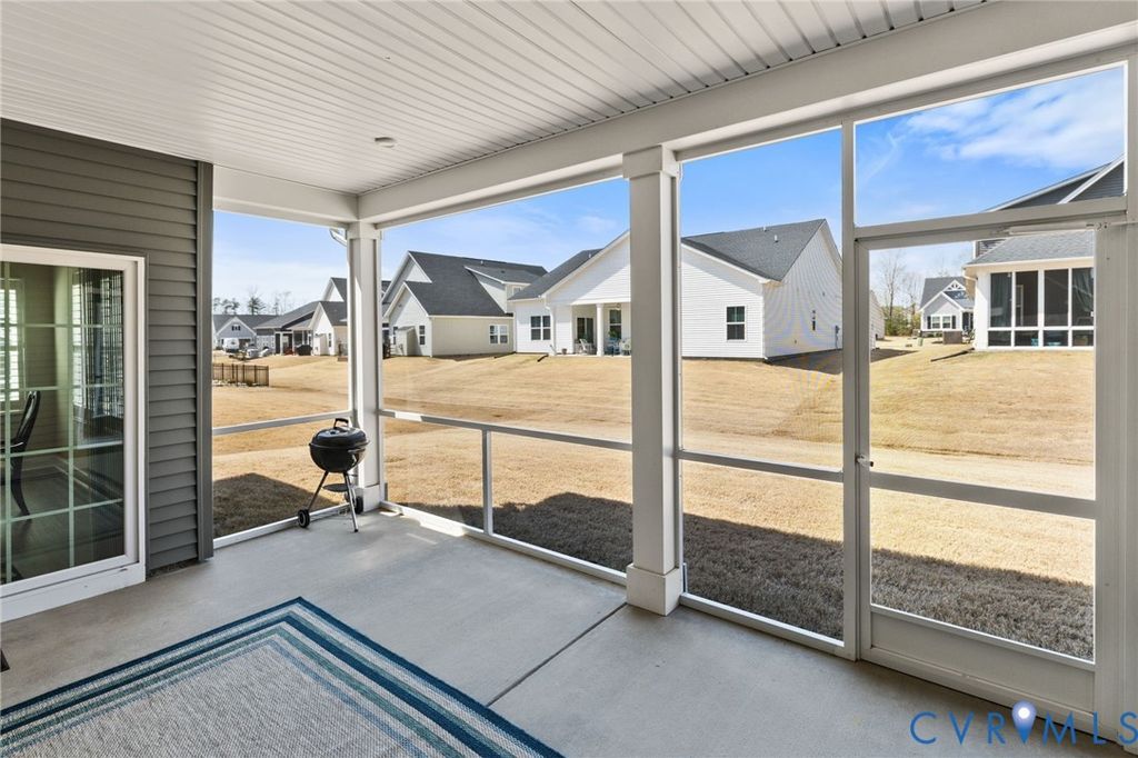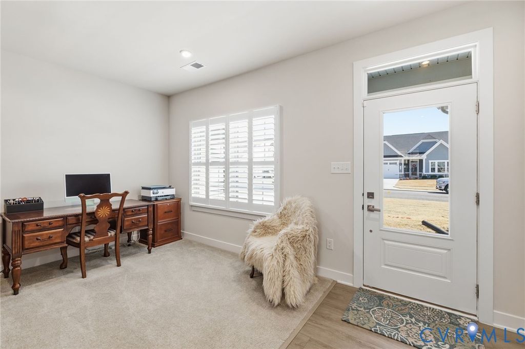 Welcome to 7644 Autumn Leaves Lane, located in the Renaissance at Four Seasons within The Groves at New Kent Estates, an active adult community offering low-maintenance living. This beautifully designed Savannah is better than new. With 4-bedrooms and 3 full baths, this home offers the ease of main-level living with thoughtful upgrades throughout. Just off the entry, a dedicated home office provides the perfect space for remote work or a quiet retreat. The open-concept kitchen, dining, and living areas create a seamless flow, ideal for both everyday living and entertaining. The living room is accented by an elegant tray ceiling, while the kitchen features a huge island, quartz countertops, high-end appliances, and a spacious walk-in pantry. Custom louvered shutters appoint the windows throughout the home. The first floor primary suite offers a tray ceiling, dual walk-in closets, and a generously sized en suite bath with a walk-in shower. Two additional bedrooms on the main level provide flexibility for guests or additional workspace. Upstairs offers additional flexible living space, including a fourth bedroom, full bath, and an open loft ideal for a second living area, hobby space, or media room, along with a finished and air conditioned storage room. With its versatile layout, thoughtful finishes, and low-maintenance lifestyle, this home stands out in one of New Kent County's most desirable and sold out active adult communities.