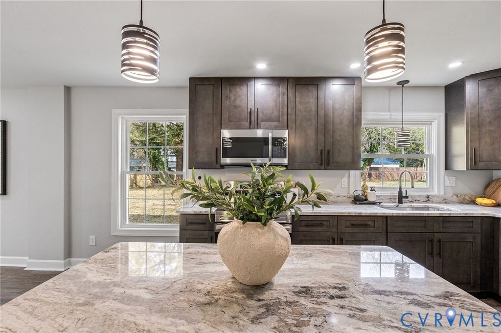 Truly turn-key ready home available now in Chesterfield's Lora Lynn Heights neighborhood (just down the street from picturesque Rieves Lake!) Outside you'll notice the new vinyl siding on this freshly made over home, and you'll have a 2-bay oversized and finished garage to protect your cars year-round (with tons of built-in storage inside plus workshop space!) The home itself features over 2,300 square feet, including 5 true bedrooms (2 primary bedrooms) and 4 full baths. The main flow of the floor plan is the living room, dining room, and kitchen - which is an open space, great for large families or entertaining! 1 bedroom is downstairs, which is convenient for an office or guest room. The living room features a charming fireplace and French doors that open up to the new wood deck out back - and a huge back yard on your completely private half acre yard surrounded by wood fencing. The kitchen features all of today's desired features: granite counters and island countertop; pot-filler kitchen faucet; stainless steel appliances (including an upgraded water-dispensing and ice-dispensing fridge and smooth-top cooking stove); and designer cabinetry with matching handles and light fixture. Throughout the home there's also new central air, paint, plumbing, lighting and fans, LVP flooring, water heater, and a new roof! All of this renovation ready for you and conveniently located off of Harrowgate and Route 10!