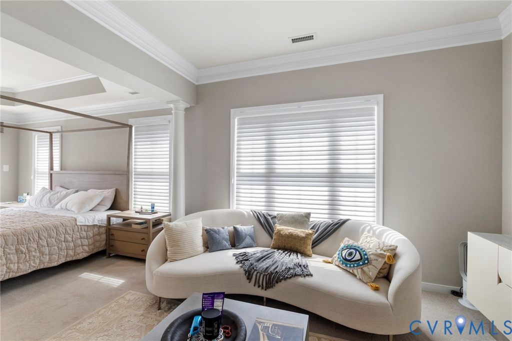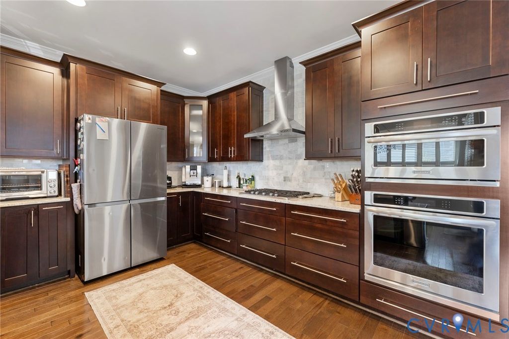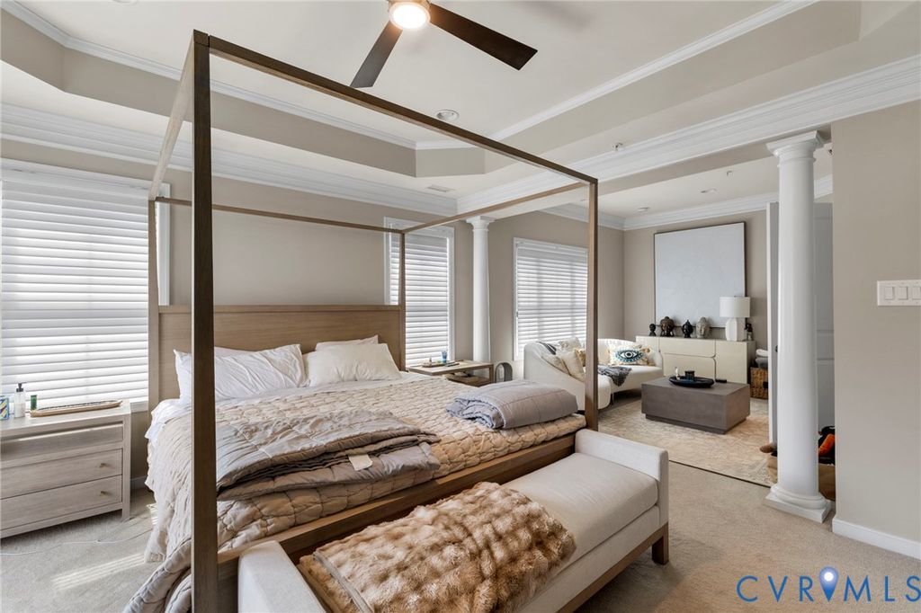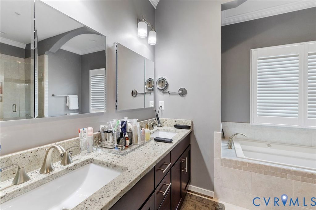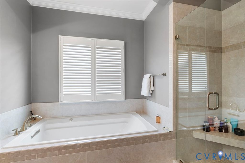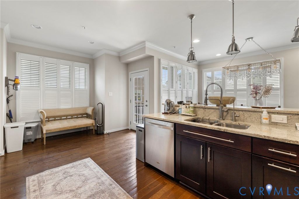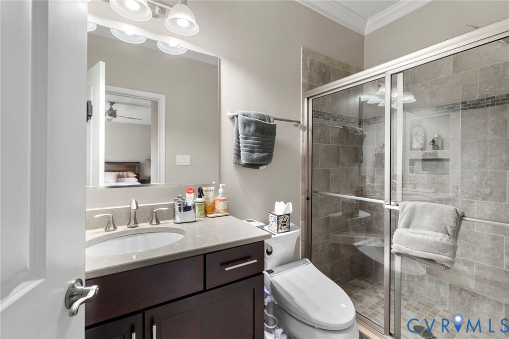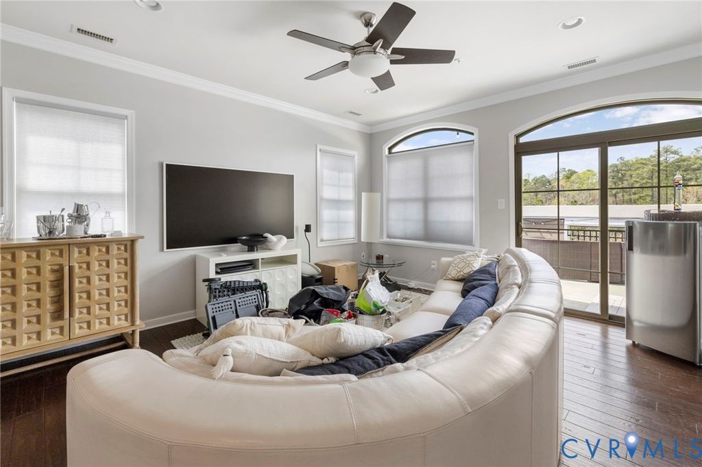 Welcome to Village Commons Walk in West Broad Village, a vibrant, walkable West End community offering an exceptional lifestyle! Enjoy easy living w/ access to Whole Foods, Trader Joe's, REI, Home Goods, boutique shops, coffee spots, fine dining, and more in your neighborhood! Picturesque walking paths, tree-lined streets, 3 tranquil ponds w/ fountains, Short Pump Park, sidewalks, & streetlights create a beautiful, community-focused setting w/ a community clubhouse, pool, & gym. This Franklin refined custom model is one of the most sought-after floor plans in the neighborhood! The wide entryway has custom side molding, railings, & wide planked Hickory hardwood flooring throughout the home. The 1st floor includes a home office, a guest bedroom w/ a full bath, & access to a two-car garage w/ a dual tub stainless sink & a water purifier. A state-of-the-art, 4-level elevator w/ an Oak Cabin (newest model) adds modern convenience. The 2nd floor features an open-concept kitchen w/ a bar-height breakfast bar, ideal for entertaining, custom lighting, plantation shutters, granite counters, a dining area, a spacious family room with built-ins, a gas fireplace, & an unobstructed view of the pond/park. Nice balcony off of the sitting area near the breakfast nook w/ a gas grill hookup. The 3rd floor includes a luxurious primary suite w/ a sitting area, a walk-in closet (custom-built-in closet system), a private balcony, a spa-style bath w/ a jetted soaking tub, & a glass-enclosed shower. An extra bedroom w/ a full bath is also located on this level, featuring stunning views of the pond/park, as well as a laundry room w/ storage. The 4th floor offers a rooftop terrace w/ stunning views, a 4th bedroom w/ en-suite bathroom, a wet bar w/ wine fridge & another family room for relaxing/entertaining. Additional features include: 2-zone HVAC (Upstairs Air Handler & coils recently replaced) & crown & picture frame moldings throughout! Refined urban living at its best.