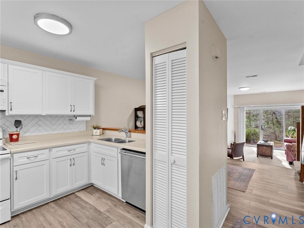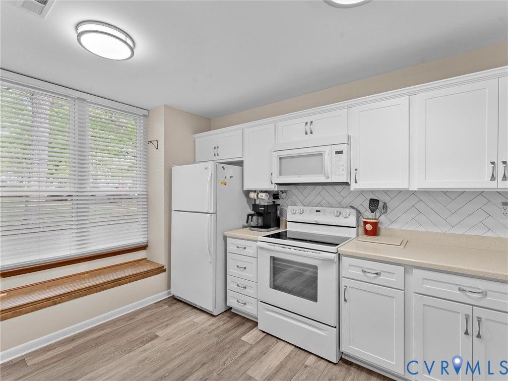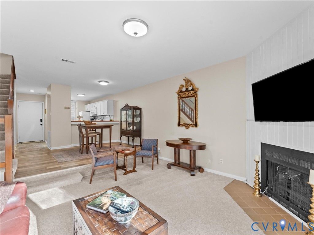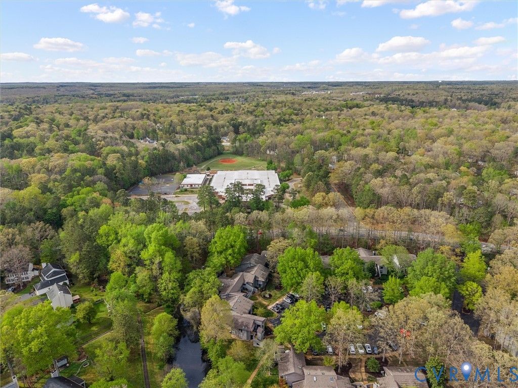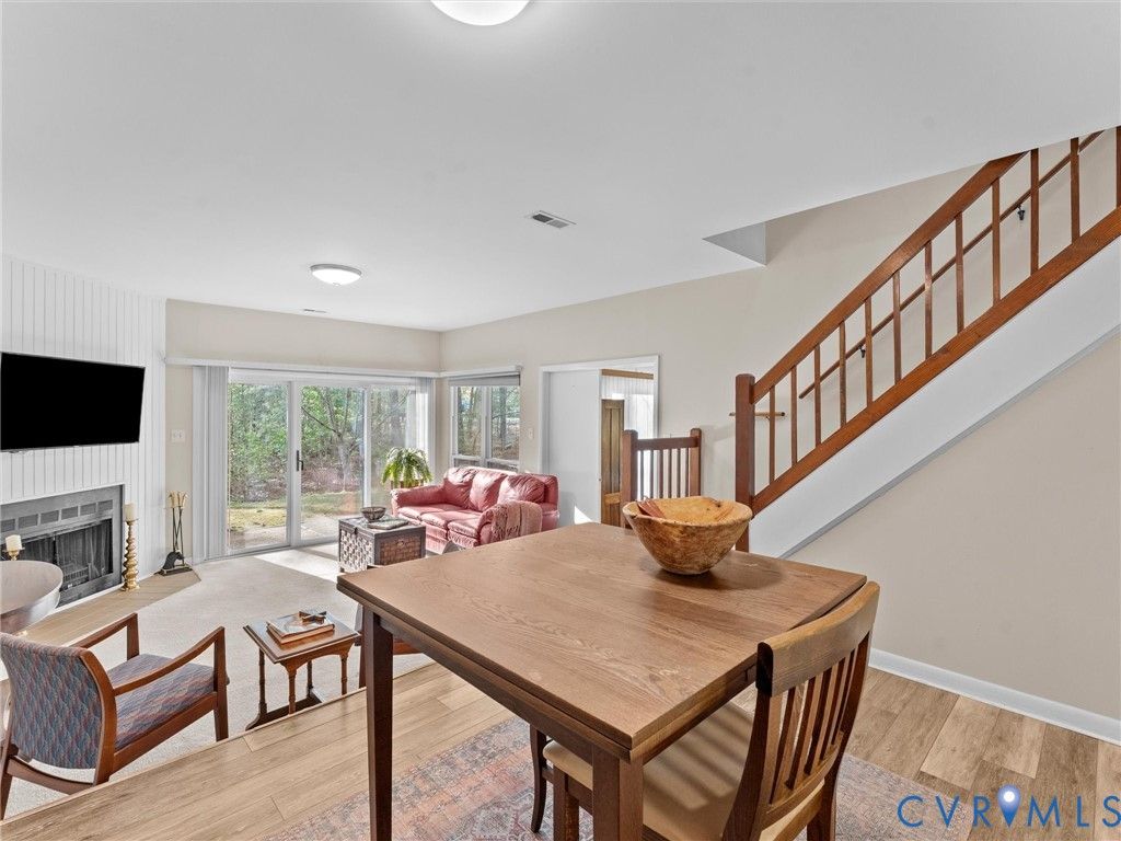 Welcome to 2828 Woodbridge Crossing Ct, a rare 3-bedroom, 2-bath contemporary condo in the desirable Woodbridge Crossing community in the heart of Midlothian. Offering 1,400+ sq ft of thoughtfully designed living space, this two-story home blends comfort, functionality, low-maintenance living and is move-in ready! Step inside to a bright, open layout with soaring ceilings and abundant natural light throughout. The spacious living room features a cozy electric fireplace and direct access to the private rear patio, perfect for relaxing or entertaining this summer. The kitchen is both stylish and functional, complete with Corian countertops, tile backsplash, dual sinks, LED lighting, a charming window seat, and an adjacent dining area. A first floor bedroom with access to a full bath and the patio offers flexible living options, ideal for guests or as a primary suite alternative. Upstairs, the primary suite features vaulted ceilings, a skylight, a spacious closet, and access to the second full bath with a separate vanity/sink area. An additional bedroom also boasts vaulted ceilings and ample storage, making it perfect for a guest room or home office. A convenient second-floor laundry area adds to the home's practicality. Enjoy peaceful outdoor living on the oversized aggregate patio overlooking a tranquil pond, along with an attached storage shed for added convenience. Assigned parking and community managed exterior maintenance provide easy, low-stress ownership. Located in a highly sought-after Midlothian location, this home is just minutes from shopping, dining, and everyday conveniences along Hull Street. Commuters will appreciate quick access to major interstates, while outdoor enthusiasts can enjoy nearby parks, walking trails, and golf courses. Whether you're a first-time buyer, downsizing, or investing, this is an excellent opportunity to own in one of Midlothian's most convenient and established communities.