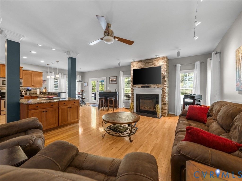 Welcome to 916 Gorham Ct, a stunning Craftsman-inspired gem tucked away in the sought-after Hawthorne Village at Charter Colony. Offering 4 bedrooms, 2.5 bathrooms, and 2,575 square feet of thoughtfully designed living space, this home beautifully balances traditional charm with modern, open-concept living. Step onto the welcoming covered porch and inside to find gleaming hardwood floors and an abundance of natural light. The elegant formal dining room flows effortlessly into a chef's kitchen boasting granite countertops, stainless steel appliances, a pantry, and an oversized island that anchors the space. Enjoy casual mornings in the eat-in breakfast nook or pull up a stool at the bar! The kitchen overlooks a spacious living room centered around a cozy gas fireplace with a striking stone surround. Built-in corner shelving, surround sound, and direct access to the rear deck make this the ultimate space for entertaining. A convenient laundry/mudroom with tile floors and a stylish half bath complete the main level. Upstairs, the hardwood floors lead to a luxurious primary suite that serves as a true retreat. It highlights a versatile 10'x7' reading nook, a spacious walk-in closet, and a spa-like en-suite bath with a double vanity, standing shower, and soaking tub. Three additional generously sized bedrooms and a full hall bath provide plenty of space for family, guests, or a home office. Outside, the meticulously maintained, fully fenced backyard and deck offer a private oasis for summer cookouts or quiet relaxation. Living in Charter Colony means enjoying resort-style amenities, including two pools, tennis and pickleball courts, multiple clubhouses, playgrounds, and an upcoming disc golf course. Nestled in the heart of Midlothian with great shopping and dining just minutes away. Don't miss your chance to call this exceptional property home!