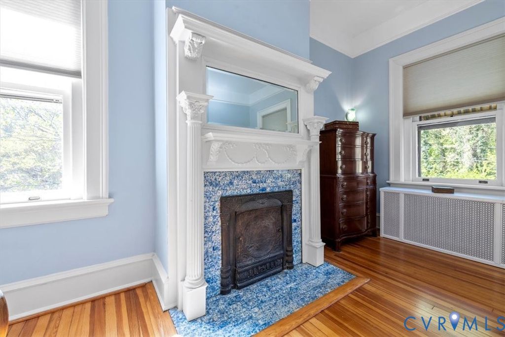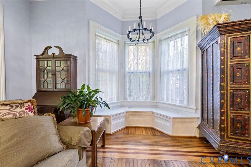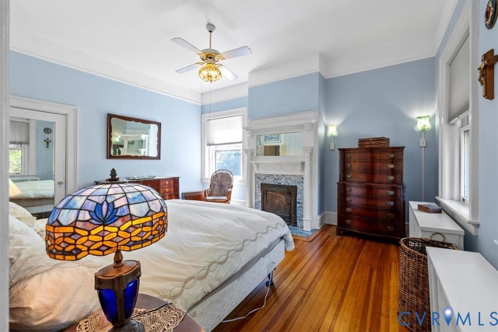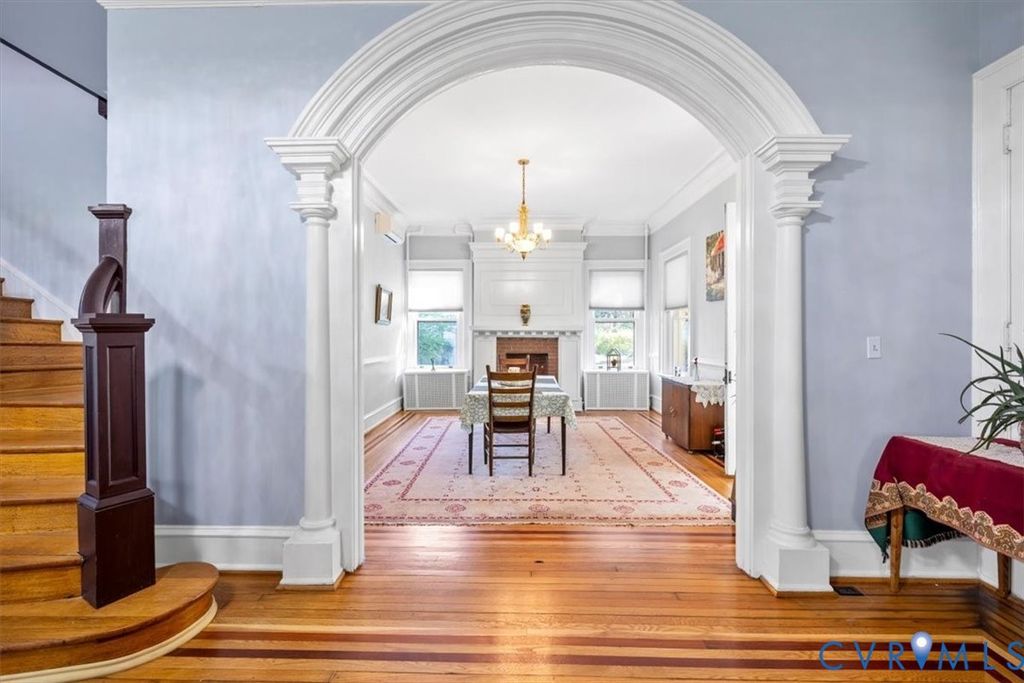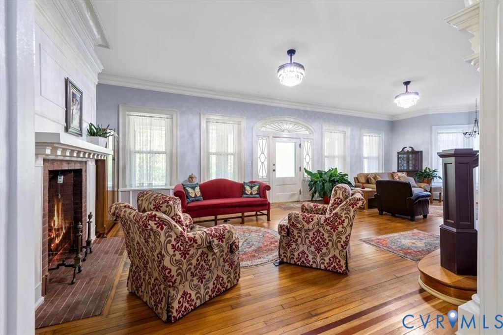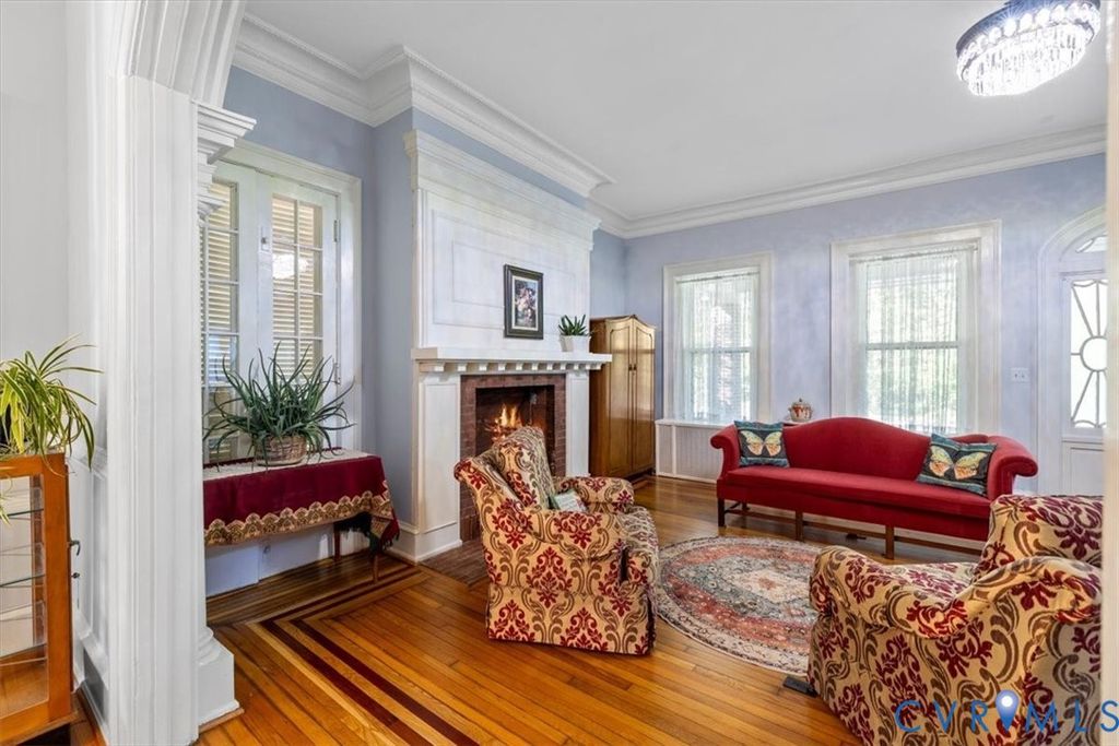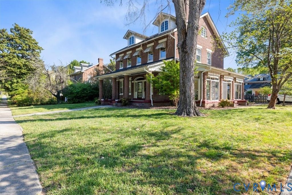 Gilded Age classic! Included in Walnut Hill Historic District listed on the National Register of Historic Places. Enter from the huge porch with unique round brick columns through the ornate fan light doorway into the huge Ballroom with grand sweeping stairway. High ceiling with Egg and Dart plaster cornices, paneled overmantel and bay window with bench seating. 2 crystal "fandoliers" add to dramatic room. An arched doorway leads to the equally elegant dining room with its own fireplace. The new kitchen features a butlers pantry with granite counter tops and gas cooktop. French doors lead from the dining room to the large sunroom spanning the width of the house and enclosed by sliding glass doors. The second floor features 3 bedrooms. 2 have ornate fireplaces and the other has a bay window. The third bedroom is set up as a potentially separate quarters with private entrance, living area and kitchenet. The walkup attic is floored and can be used as a hobby area. The partial basement has an outside entrance and makes a great exercise area. The fenced back yard has a 2 car garage with attic storage and a separate shed. There is also an auxilary well for watering and powerwashing. Located on a corner lot with a wooded lot across the street providing privacy. Walnut Hill is Petersburg's premier neighborhood and is only minutes away from the new casino, hospital and pharmaceutical cluster, Richard Bland College and the revitalized downtown. Come see what elegant living can be in your own historic home.